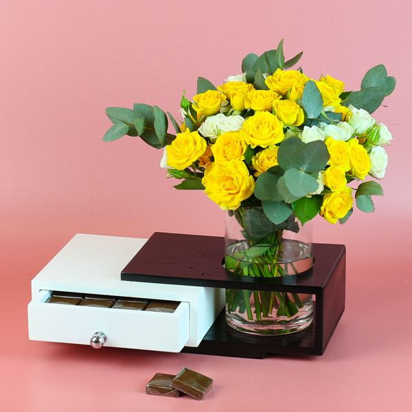 البوكيه يحتوي على خليط من زهور الجوري والشوكولاتة.