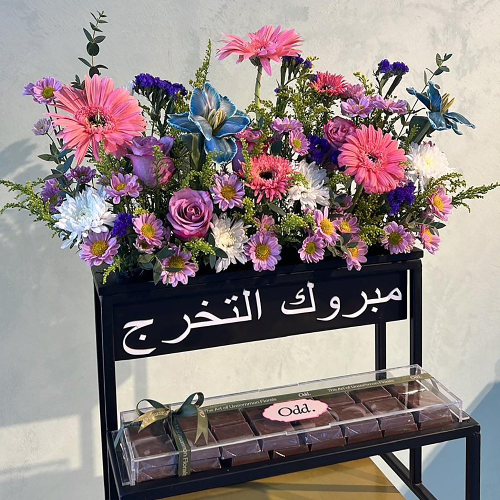 هذه الباقة تحتوي على جوري صغير برتقالي وورود جربيرا كرِيس وورود توليب برتقالية فاتحة مع الشوكولاتة.