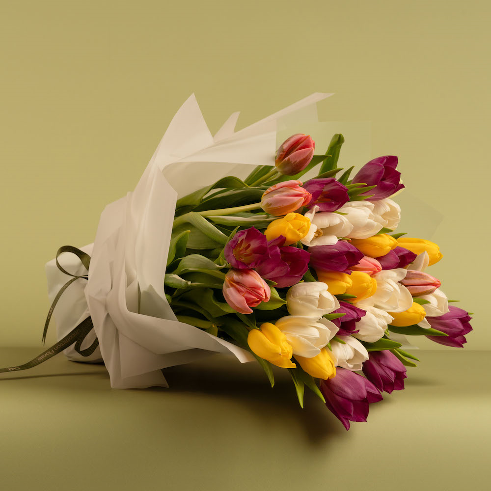 هذه الباقة الأنيقة من زهور التوليب متعددة الألوان البيضاء والصفراء والوردية والبنفسجية وبتغليف أبيض.