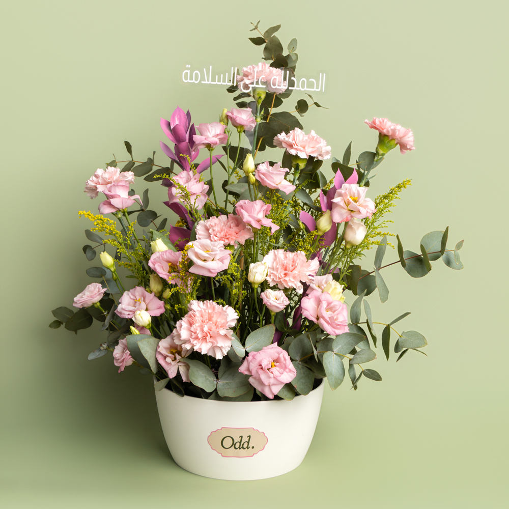 يحتوي البوكيه الوردي الفاخر على زهور الماثيولا والقرنفل والأوكالبتوس والسوليداجو.