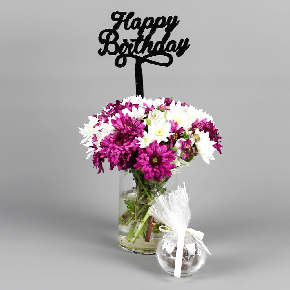 فازة تحتوي على زهور الستروميريا والأوراق الخضراء مع الشوكولاتة.