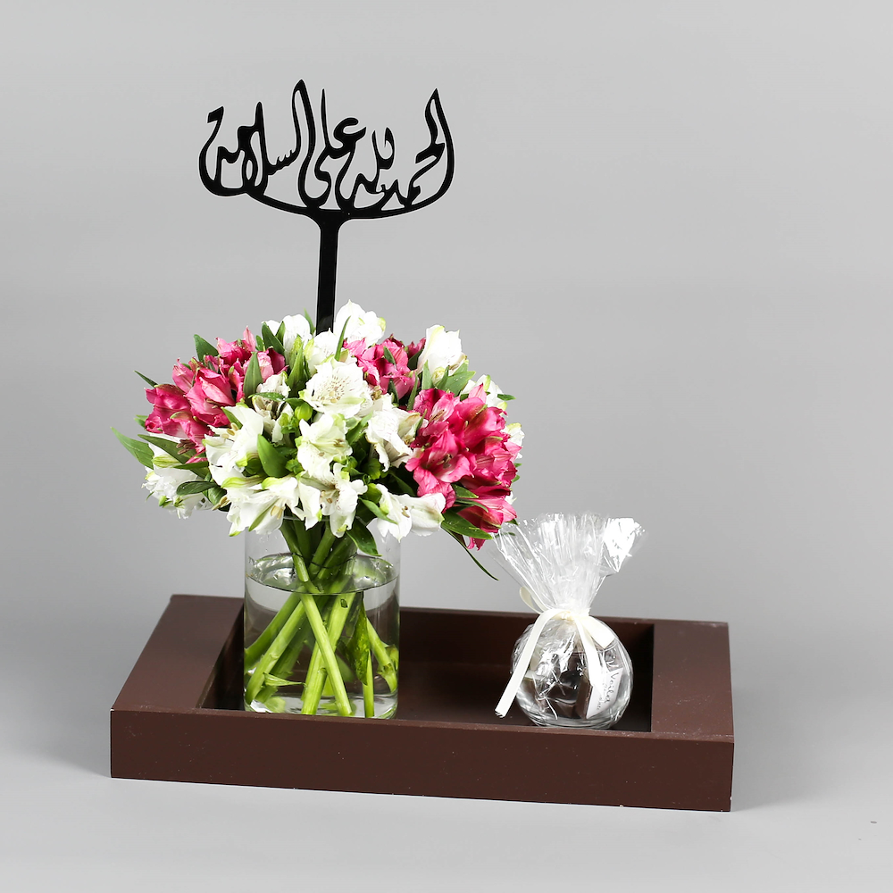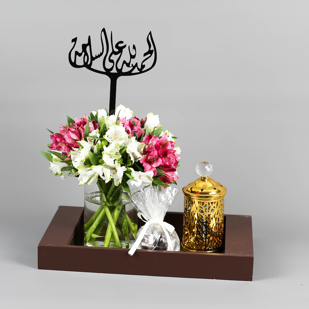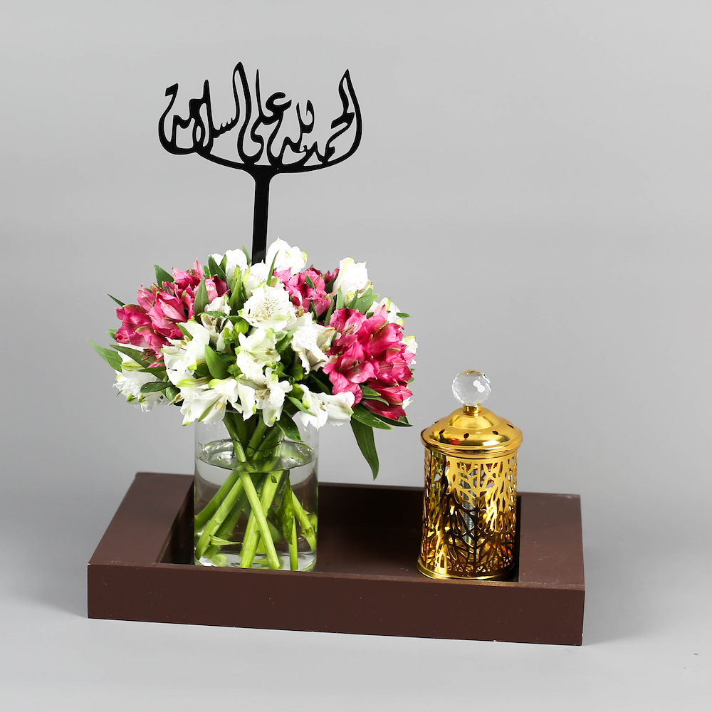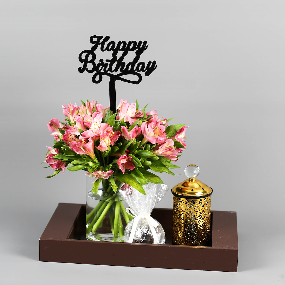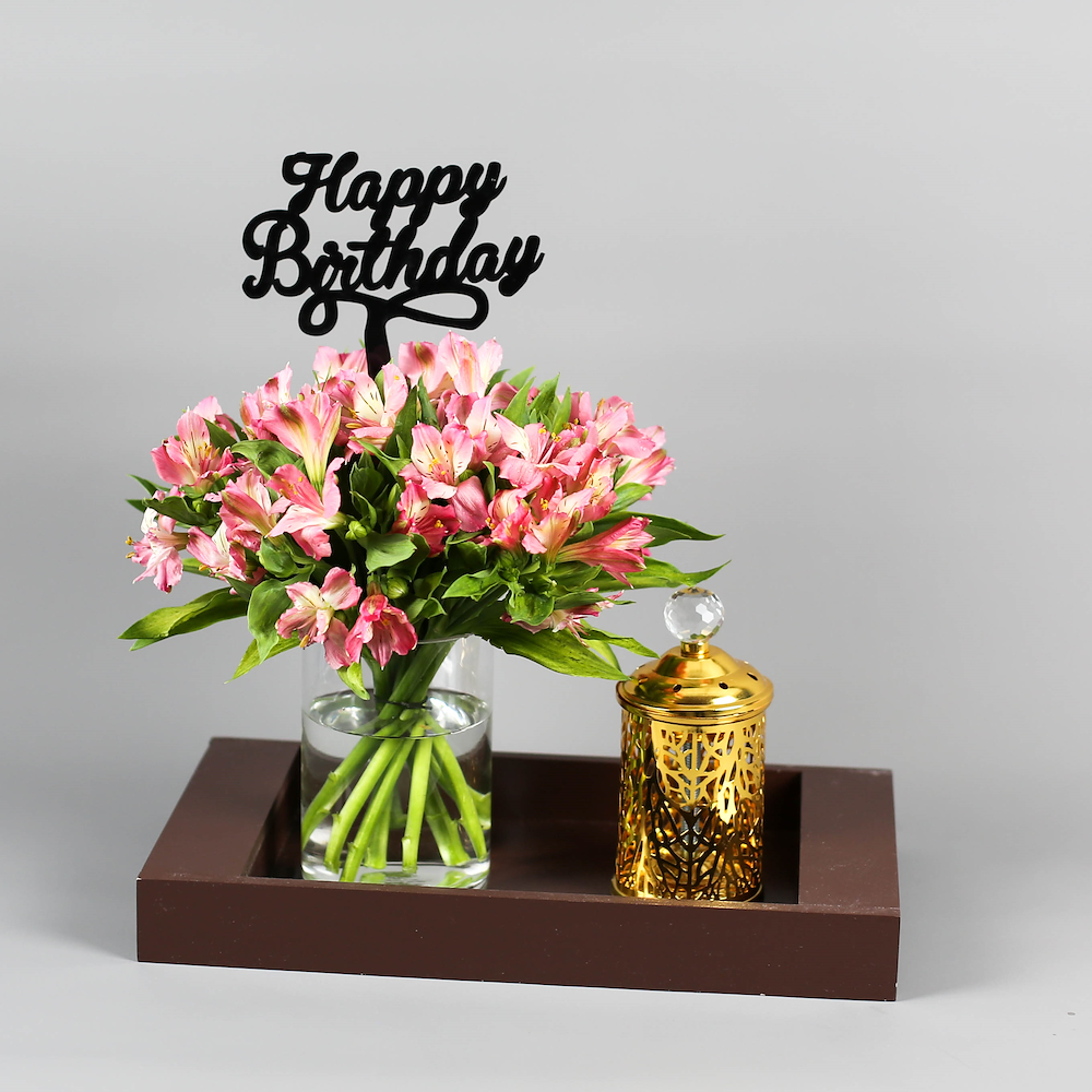 فازة تحتوي على زهور الستروميريا مع مبخر.
