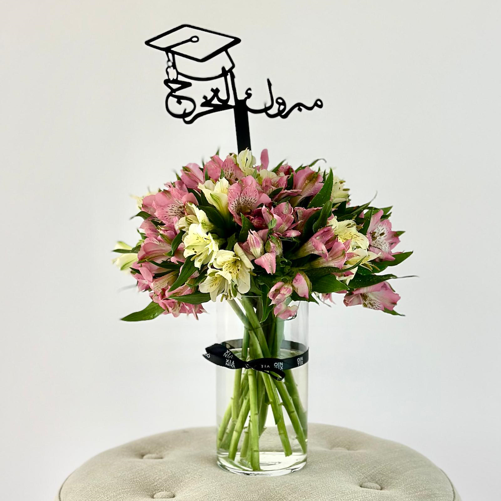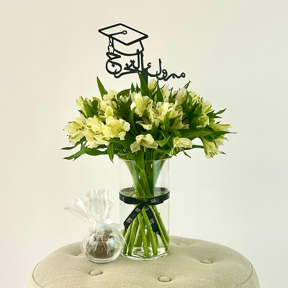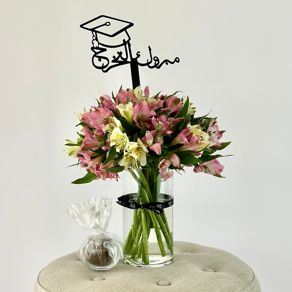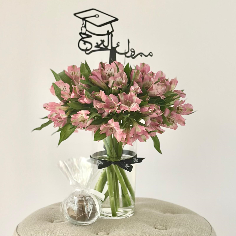 هذه الباقة تحتوي على مزيج من زهور البيبي جوري مع الشوكولاتة.