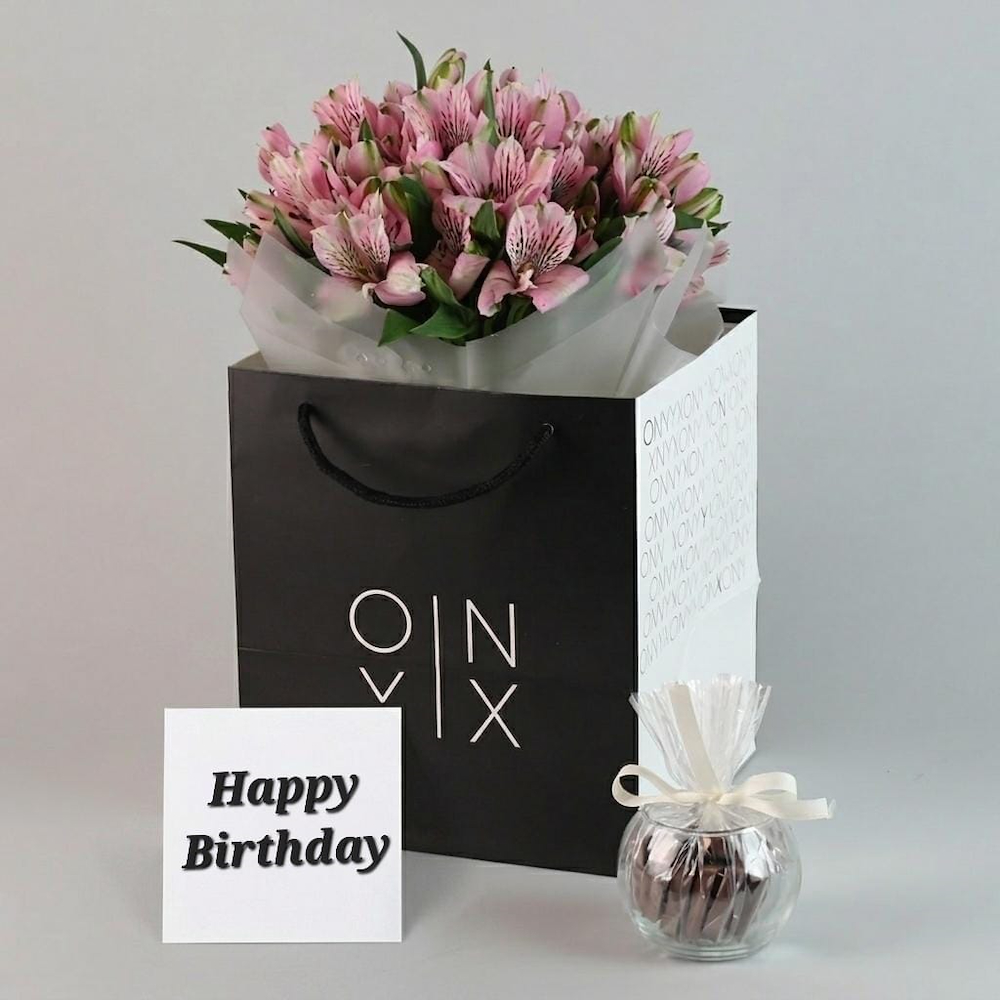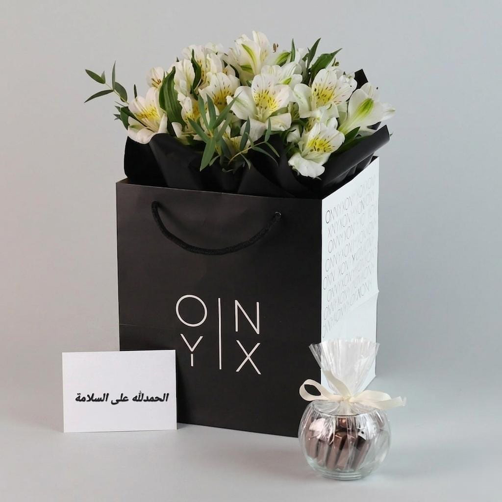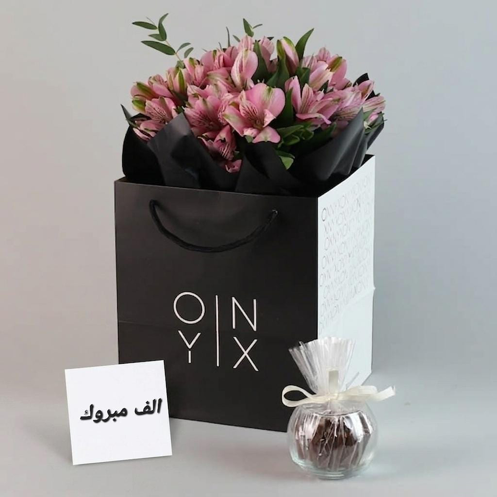 باقة يد تحتوي على زهور الألستروميريا مع الخضار. تأتي مع الشوكولاتة.