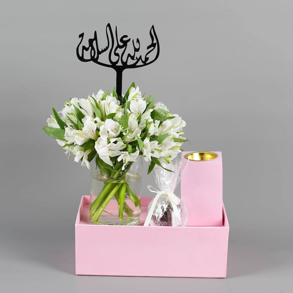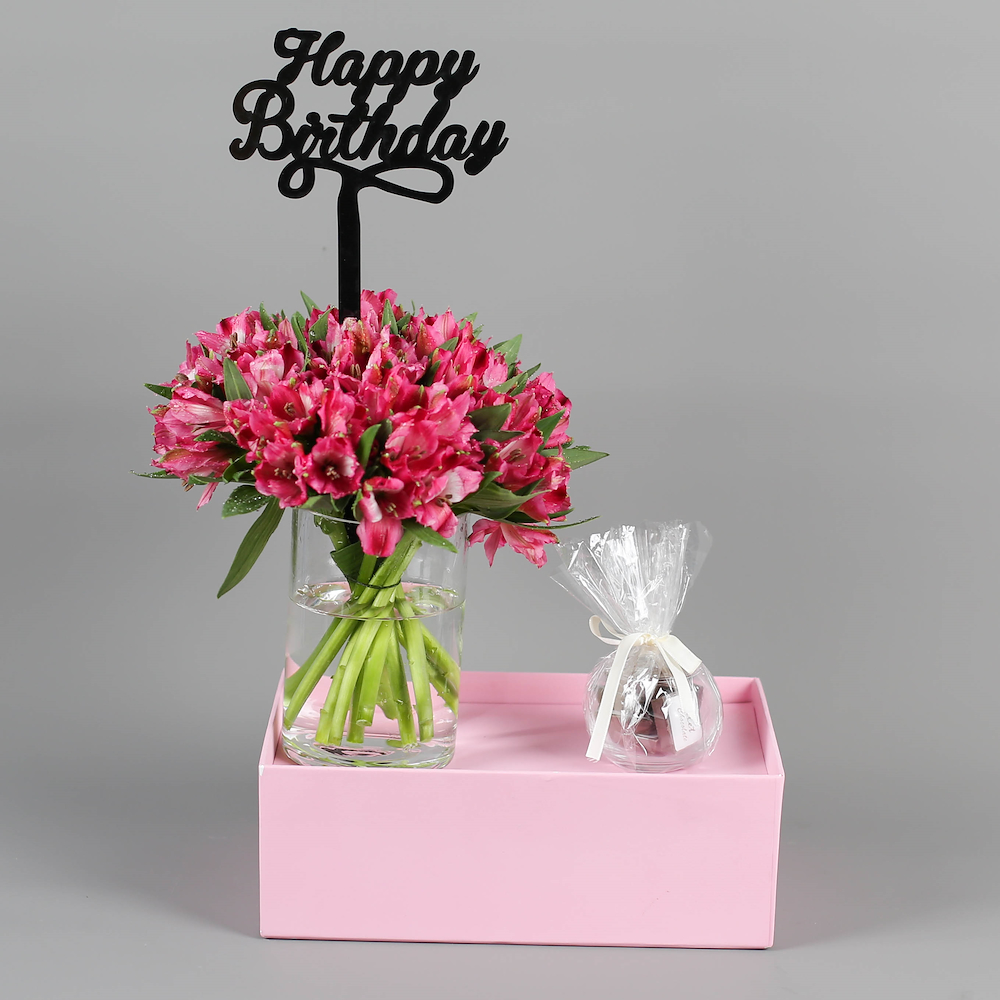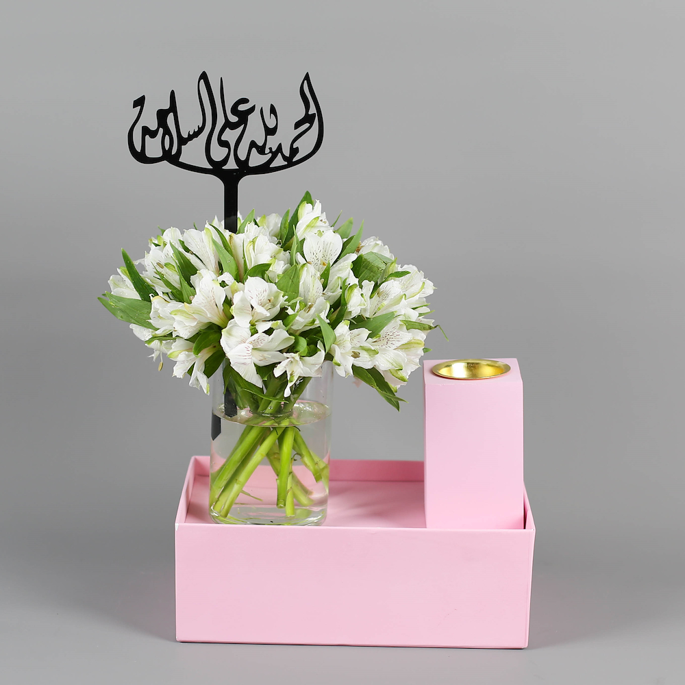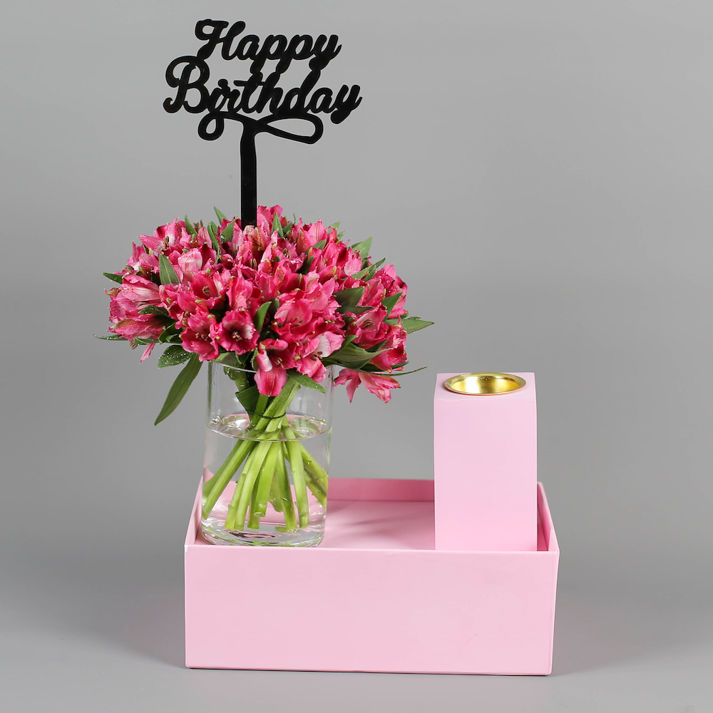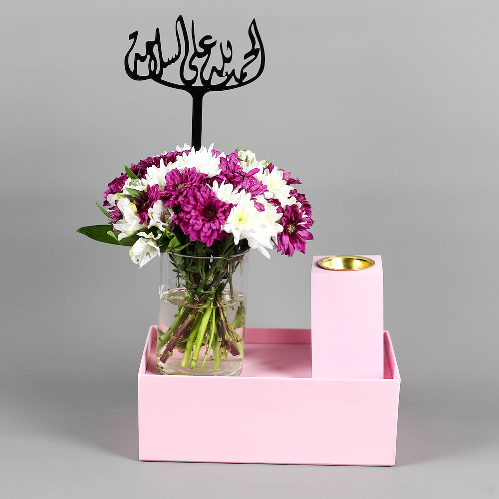تنسيق زهور في فازة يحتوي على زهور الكريز والألستروميريا، يأتي مع بمبخر، يجمع بين الأناقة الزهرية واللمسة العطرية التقليدية.