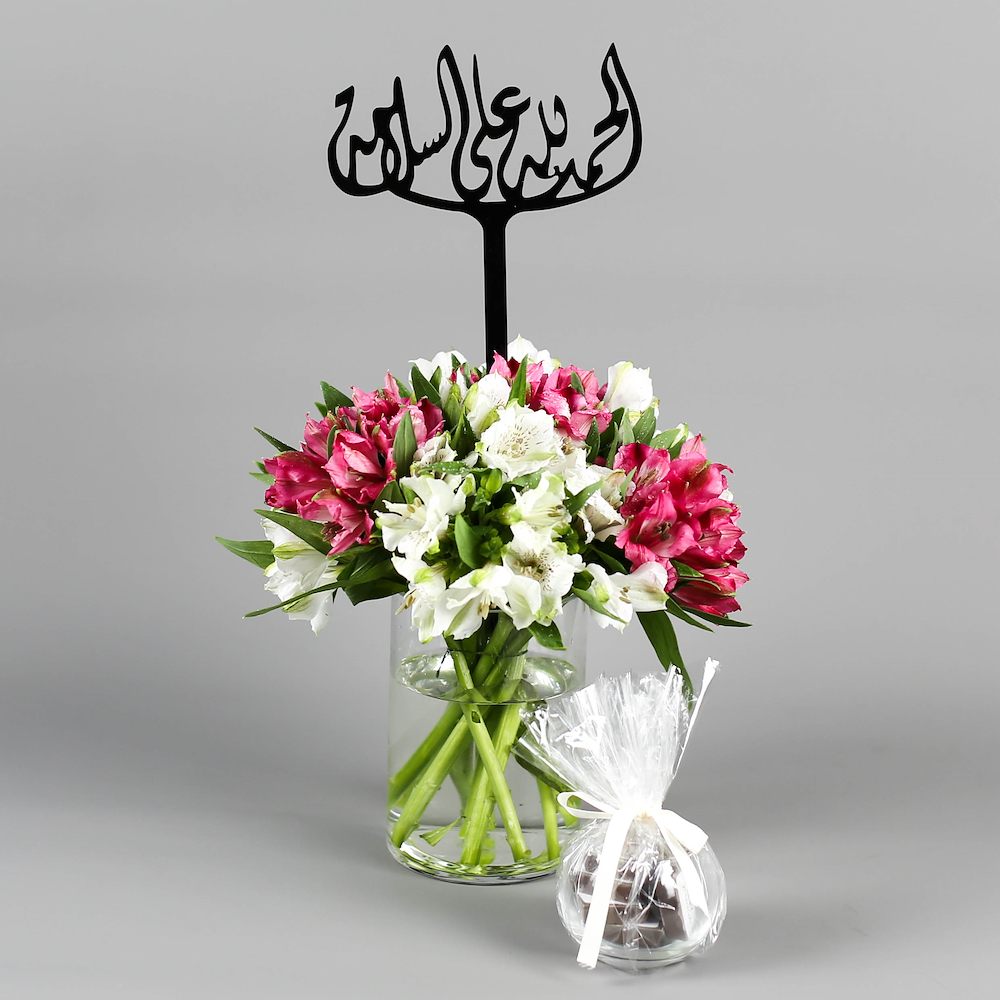 باقة زهور في فازة تحتوي على زهور الألستروميريا ومرفقة بالشوكولاتة، تجمع بين جمال الزهور المنعشة والمتعة الحلوة لتقديم هدية أنيقة.