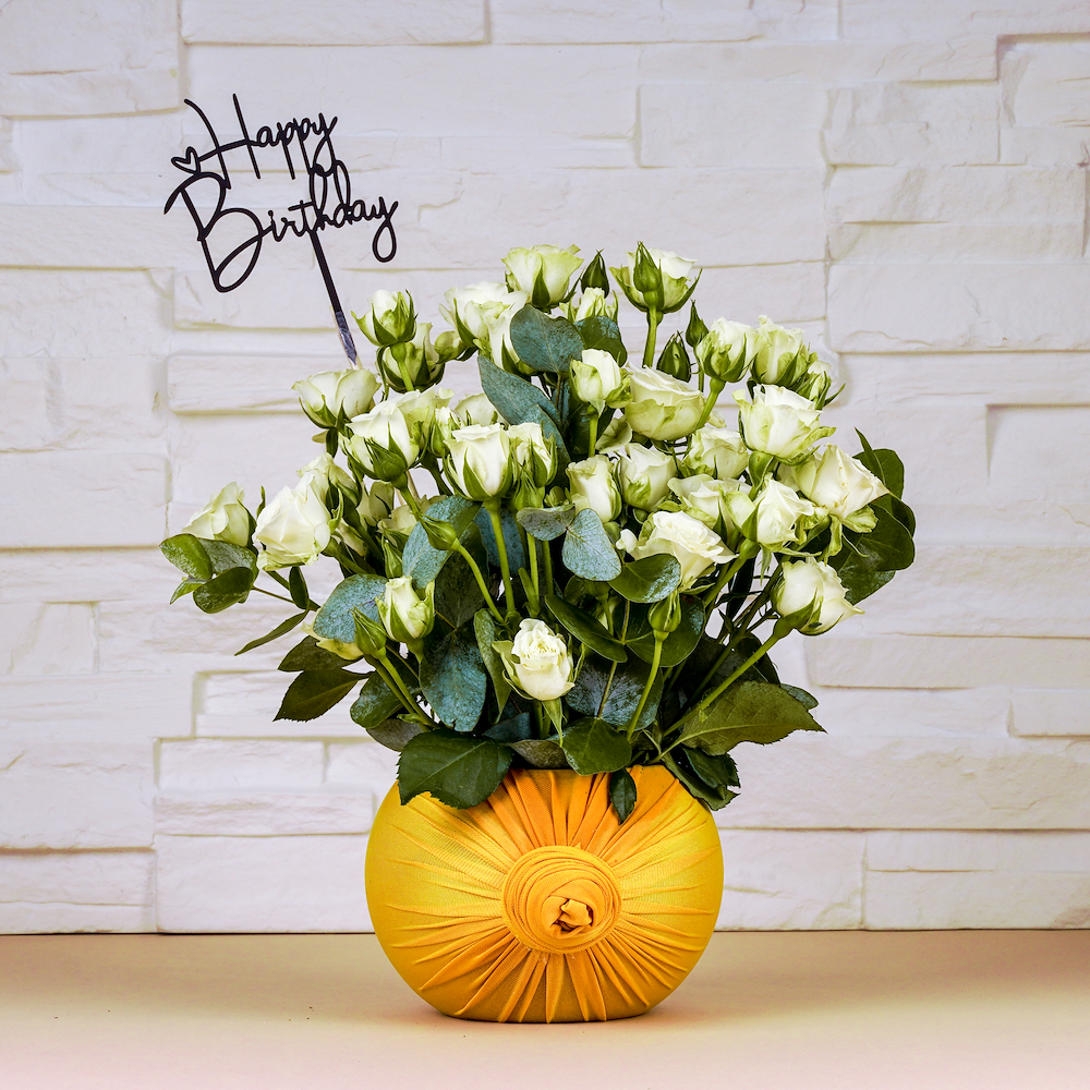 صندوق خشبي يحتوي على نباتات الأوركيد البيضاء مع زهرة قماشية من الكروشية باللون الأزرق.