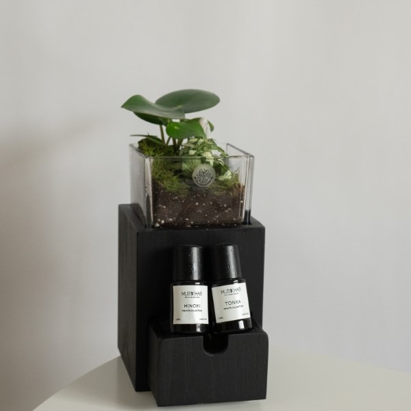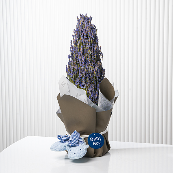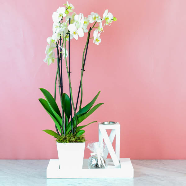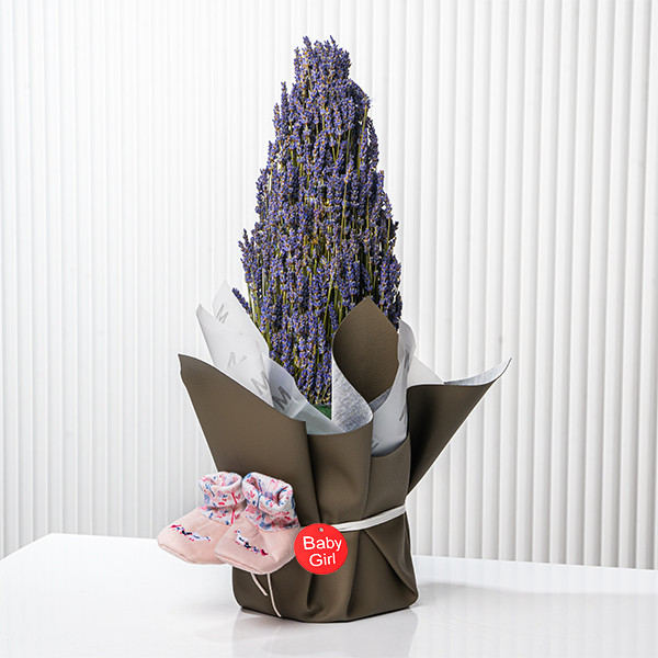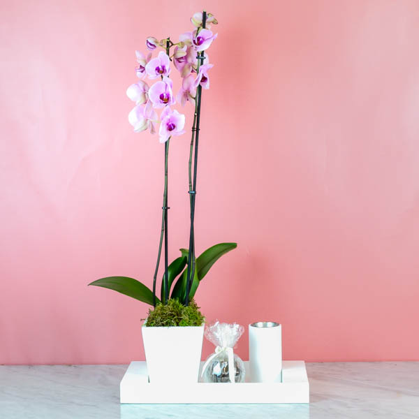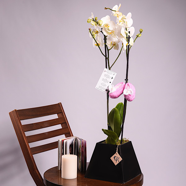 صندوق خشبي يحتوي على نباتات الأوركيد البيضاء مع جوارب باللون الوردي من الكروشيه بحياكة يدوية هدية للمولودة.