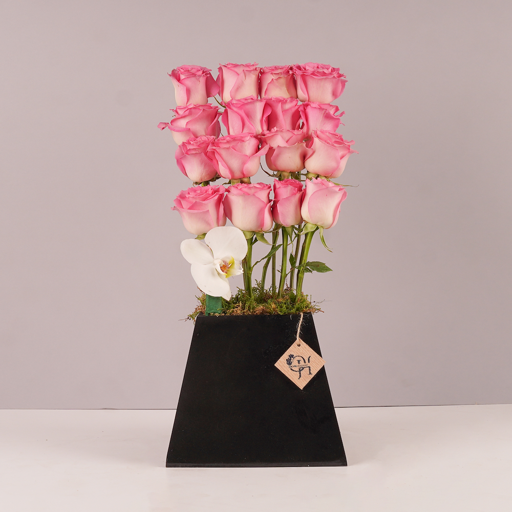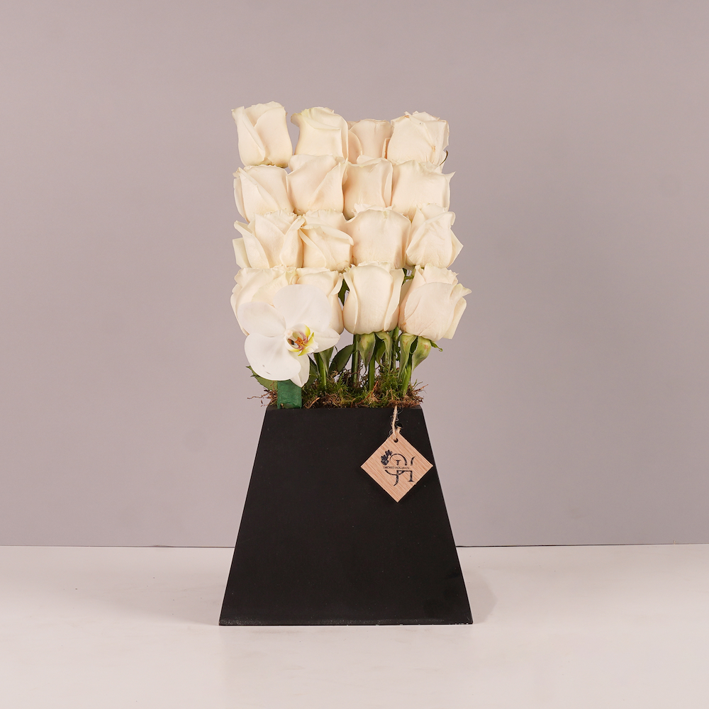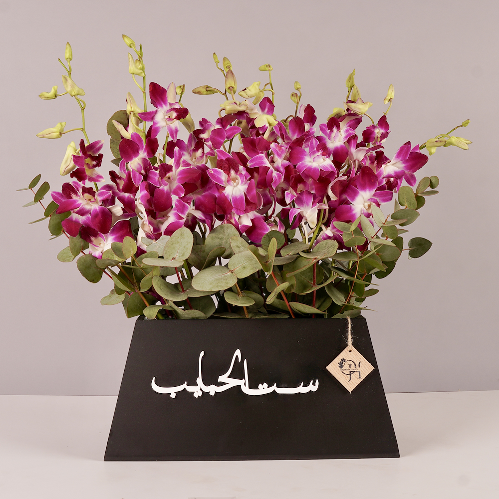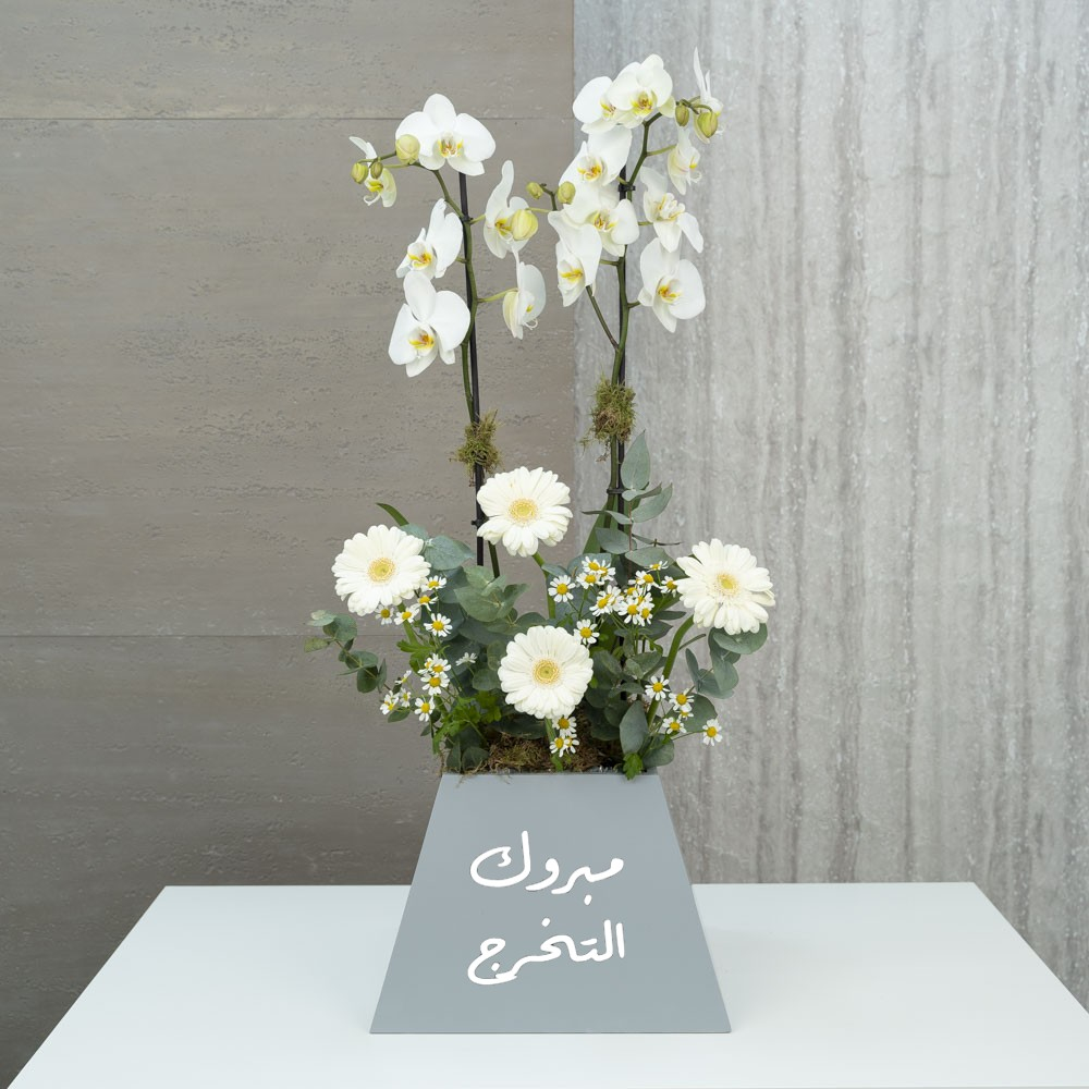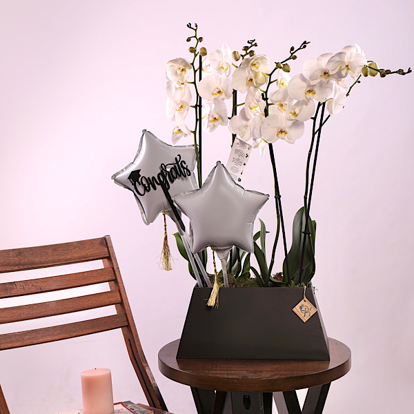 نباتات الأوركيد البيضاء في صندوق من الخشب، مع بالونات على شكل نجمة.