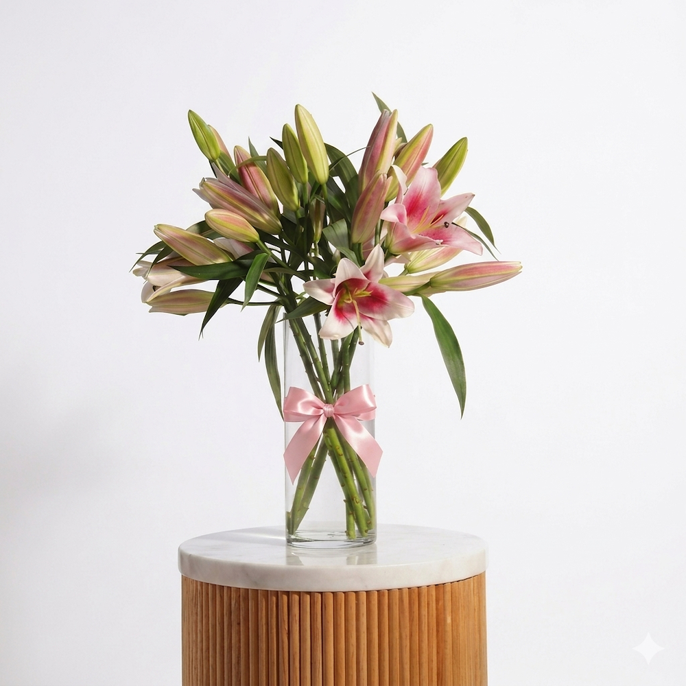 زهور الليلي الشرقية المختارة بعناية، حيث يلتقي بياض البتلات بنقاء الوردي لترسم لوحة فنية تنبض بالحياة.