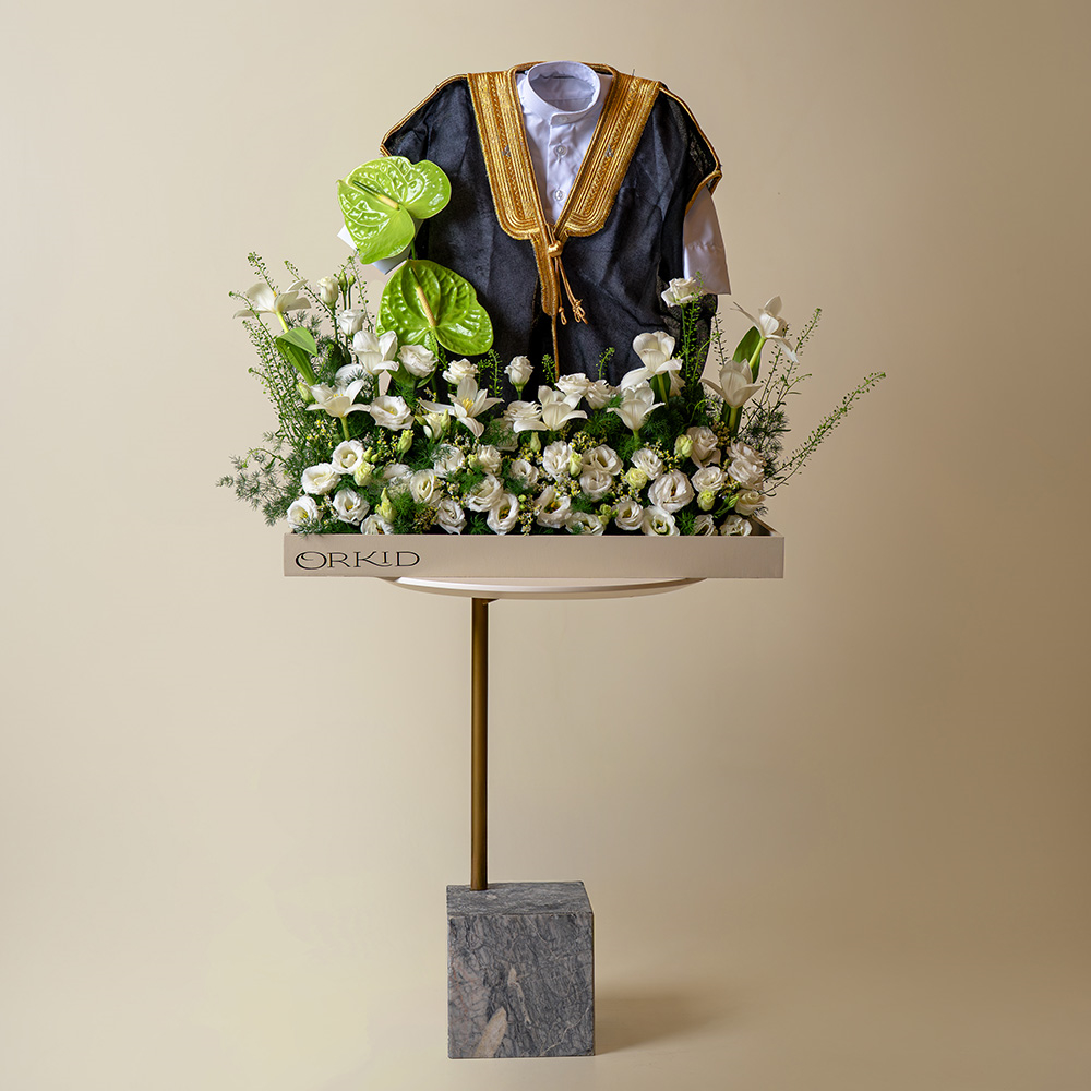 باقة تحتوي على زهور الأنثوريوم، البيبي جوري والتوليب، مرتبة بشكل جميل في صينية وتأتي مع بشت.