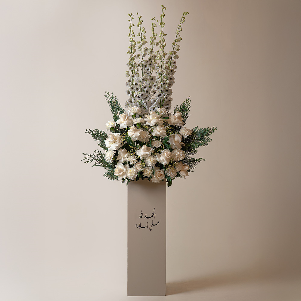 باقة تحتوي على زهور الجوري، الدلفينيوم والكارنيشن، مرتبة بشكل جميل في ستاند.