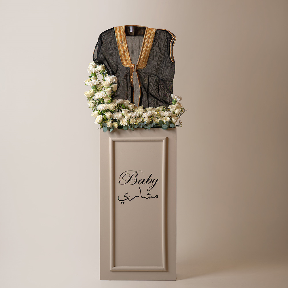 صندوق يحتوي على زهور البيبي جوري والكارنيشن، مرتبة بشكل جميل في ستاند وتأتي مع بشت.