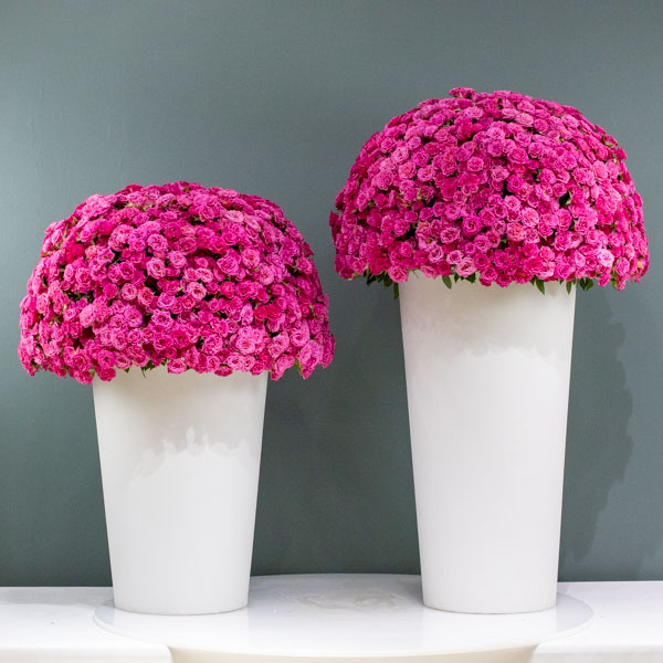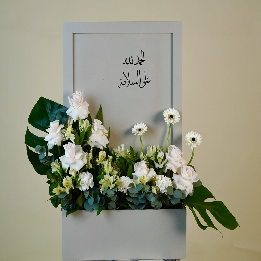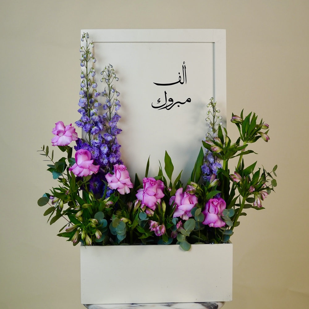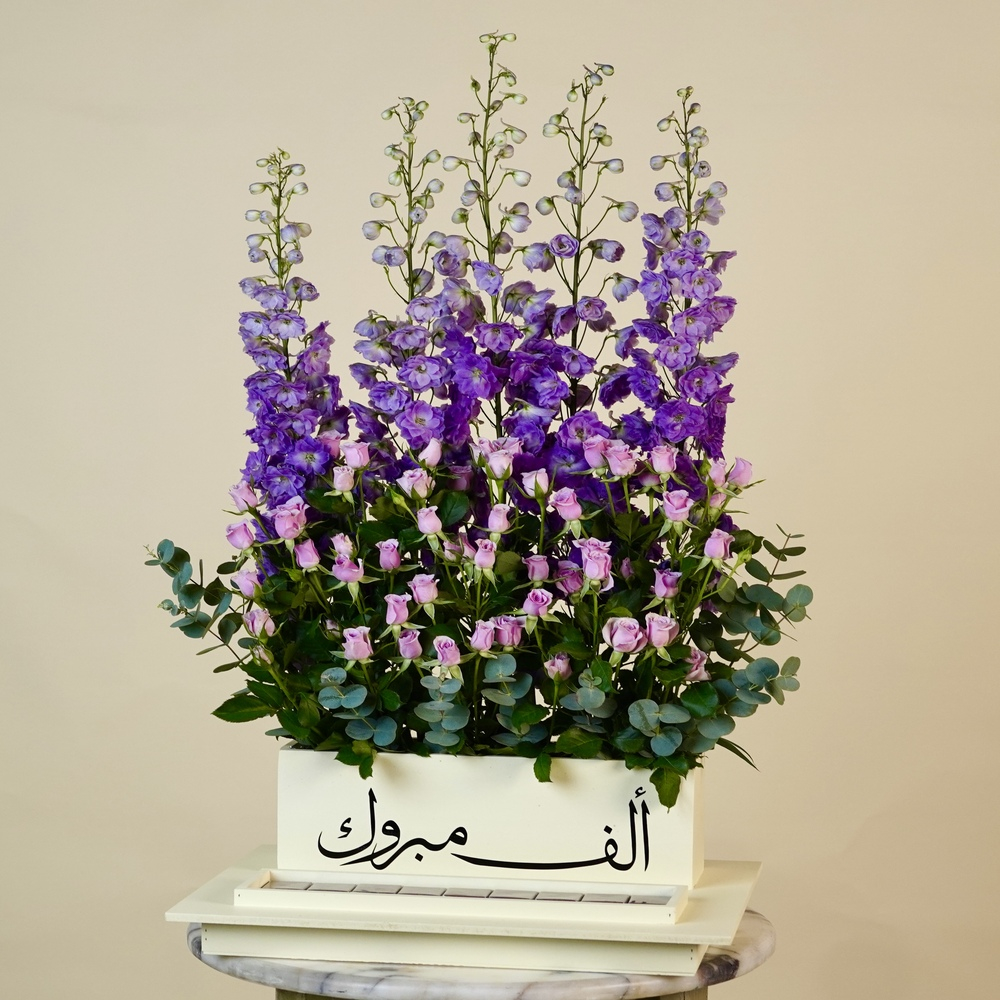 زهور الجوري والدلفينيوم المرتبة بشكل جميل في علبة.