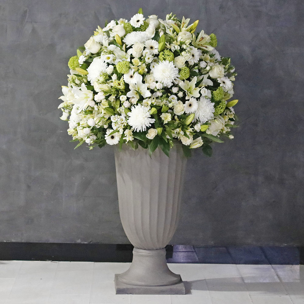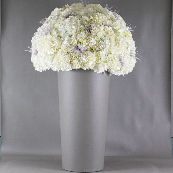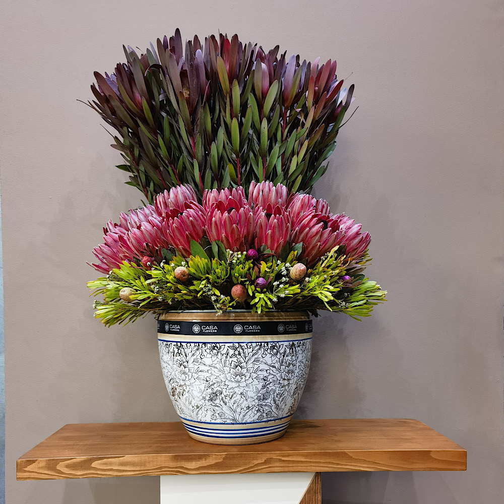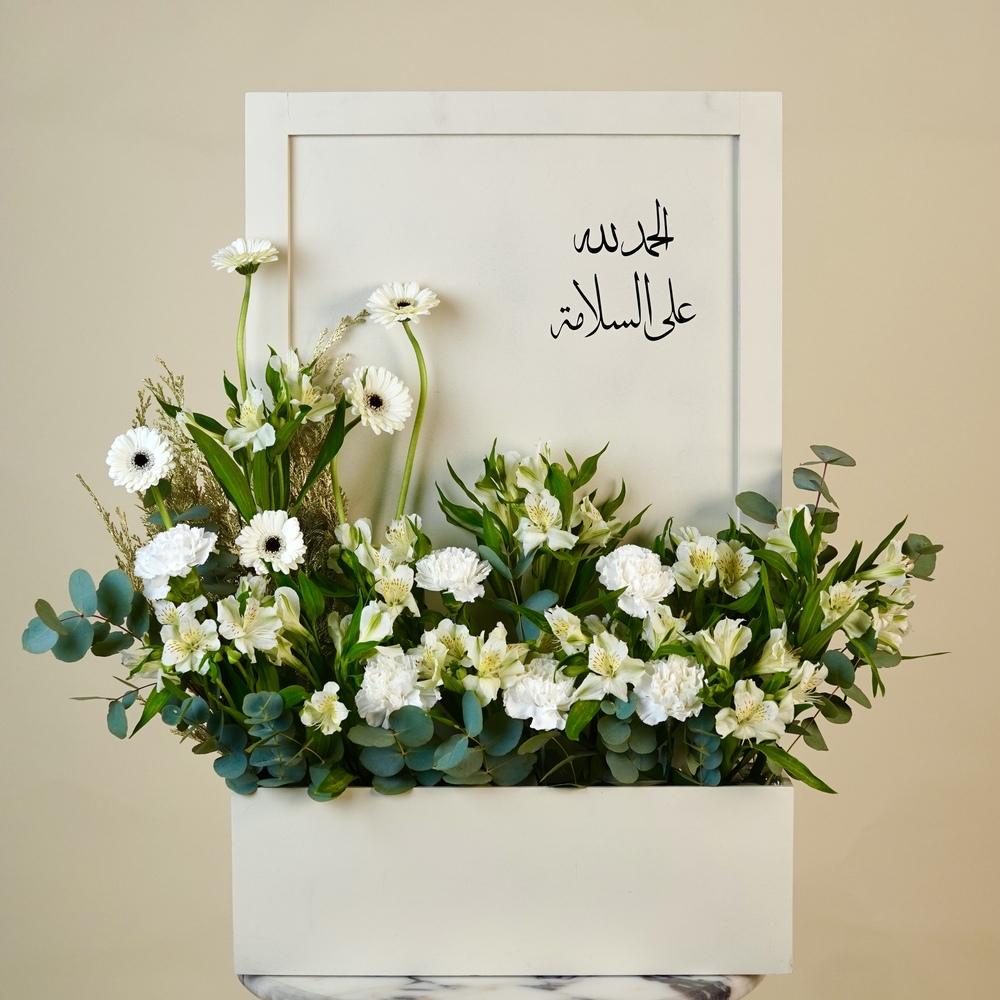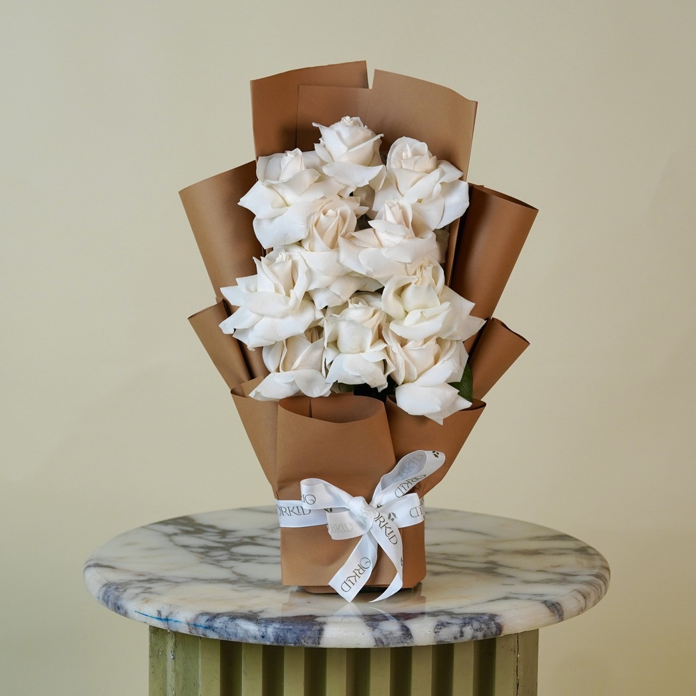 زهور الجوري والدلفينيوم المرتبة بشكل جميل في علبة.