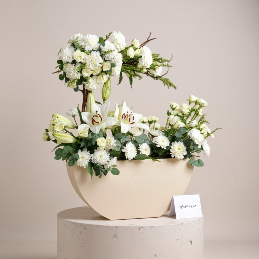 هذا الستاند يحتوي على زهور الجوري، الدلفينيوم، التوليب والجيربيرا مع الشوكولاتة.
