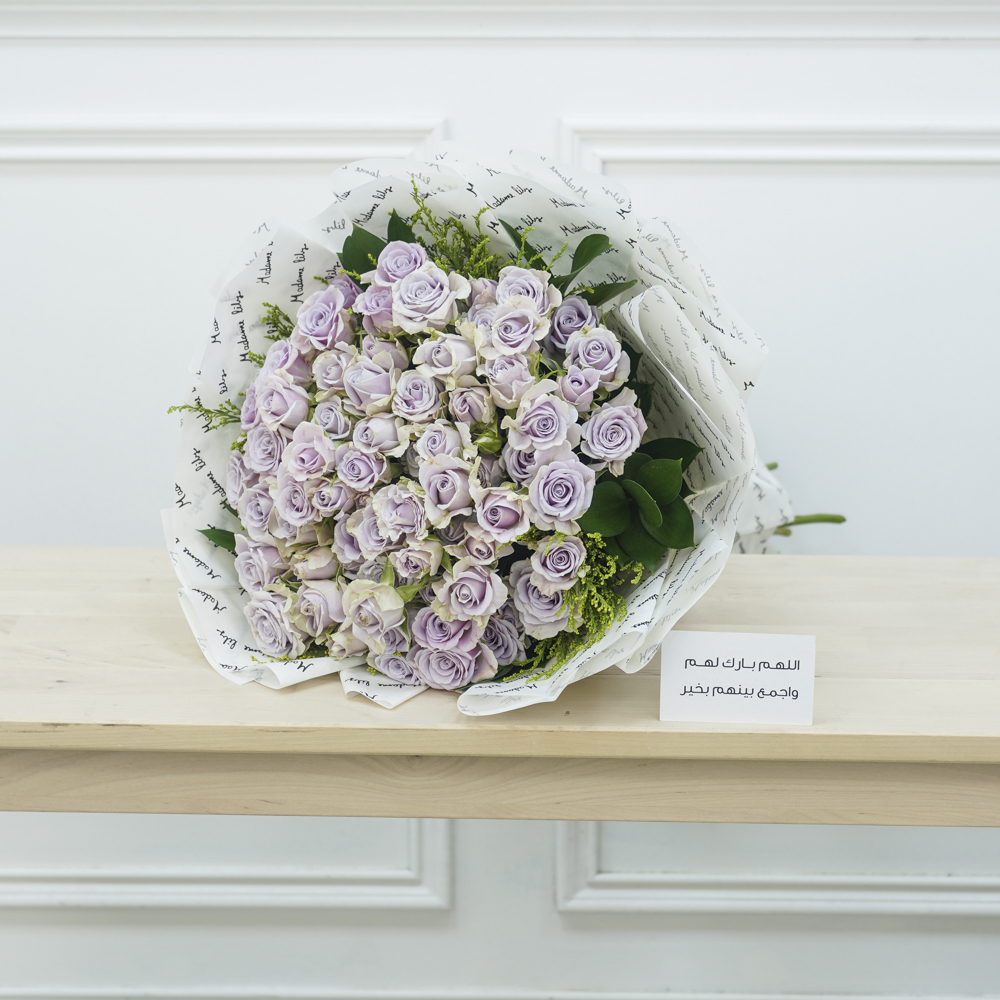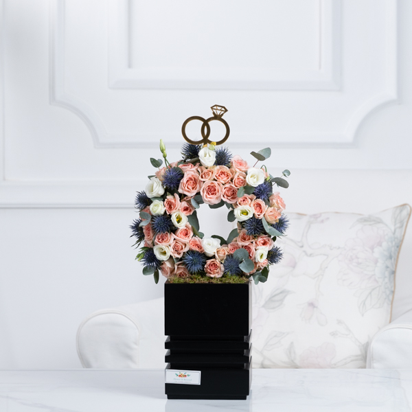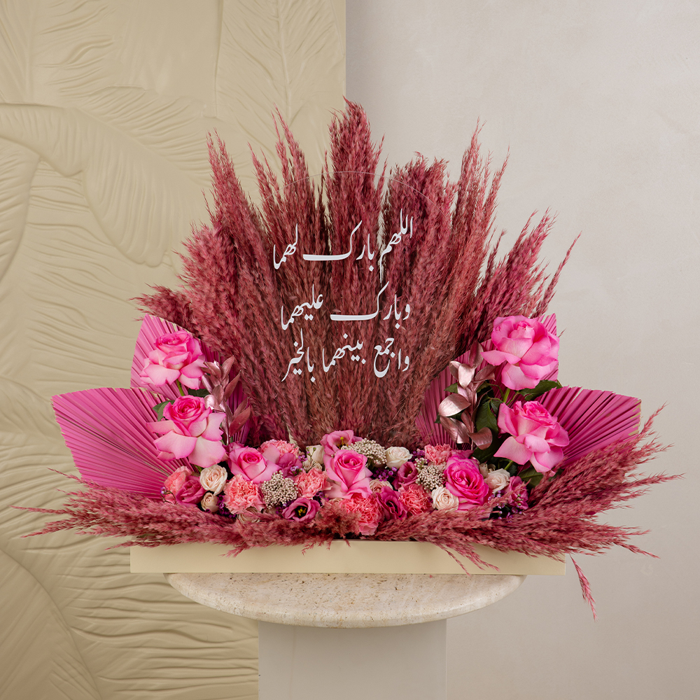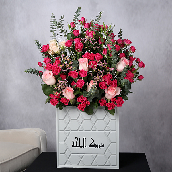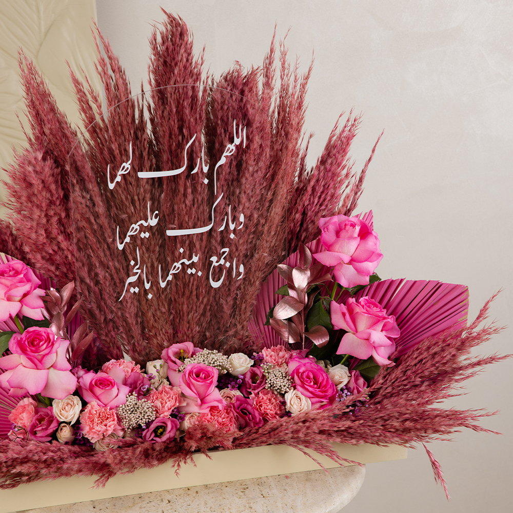 صينية تحتوي على زهور البيبي جوري، الجوري والكارنيشن مع زهور الواكس. يمكن تغيير الكتابة على الباقة.