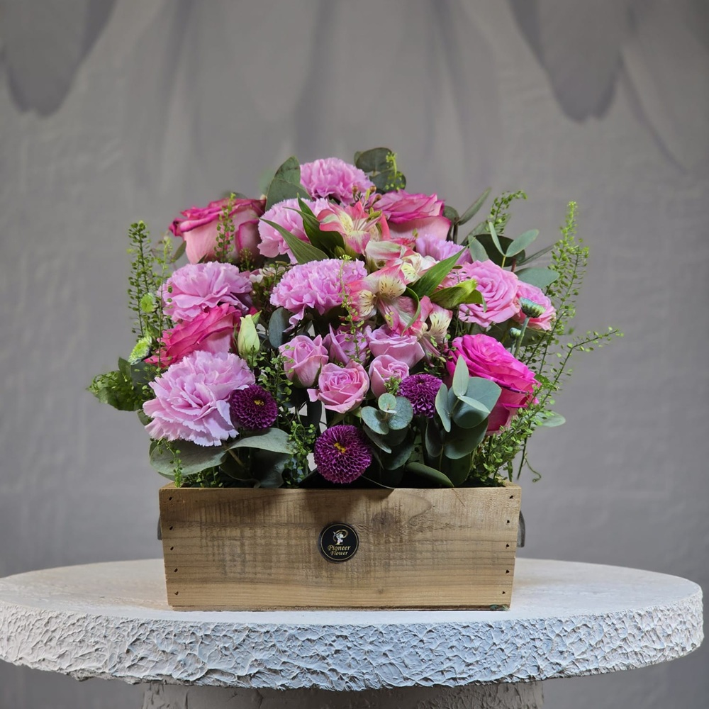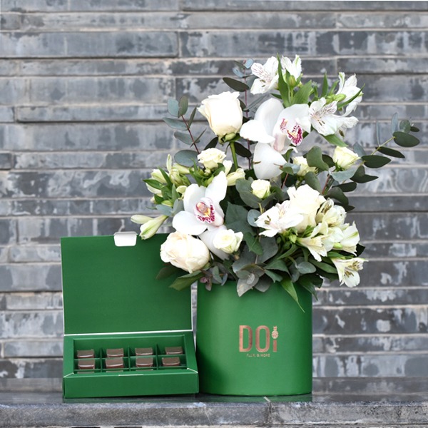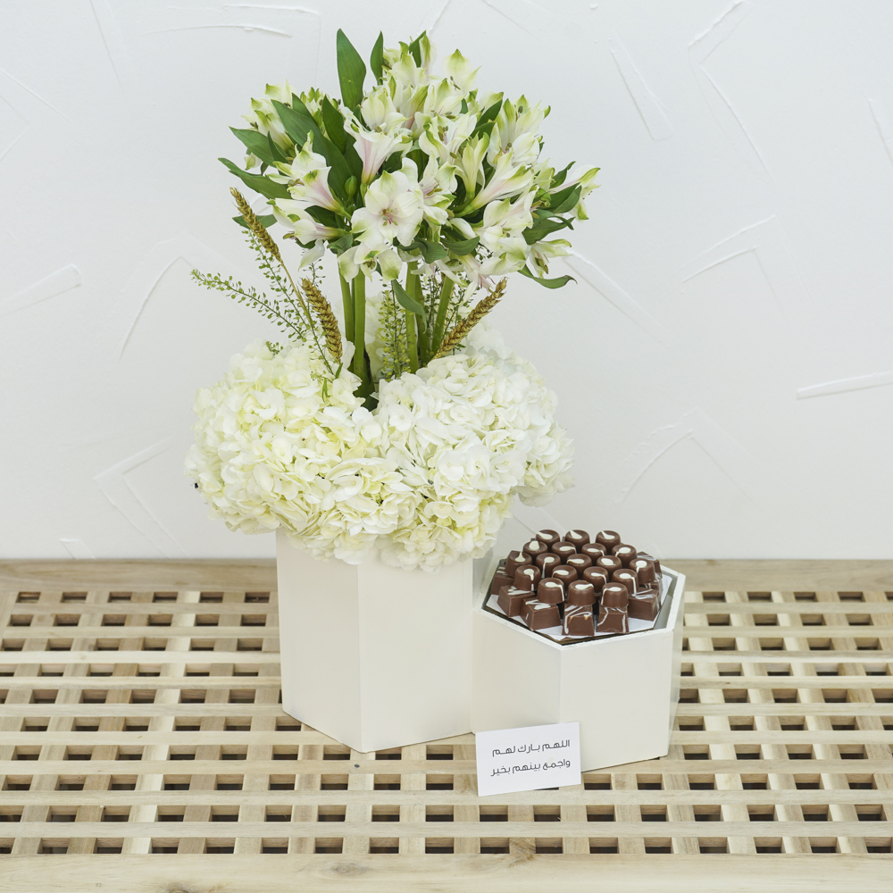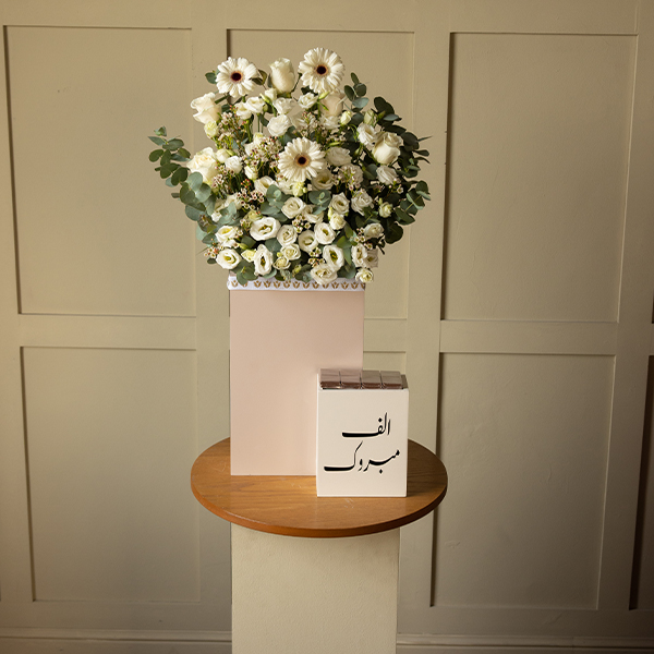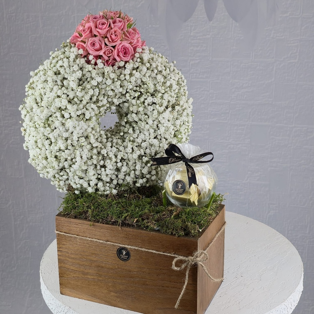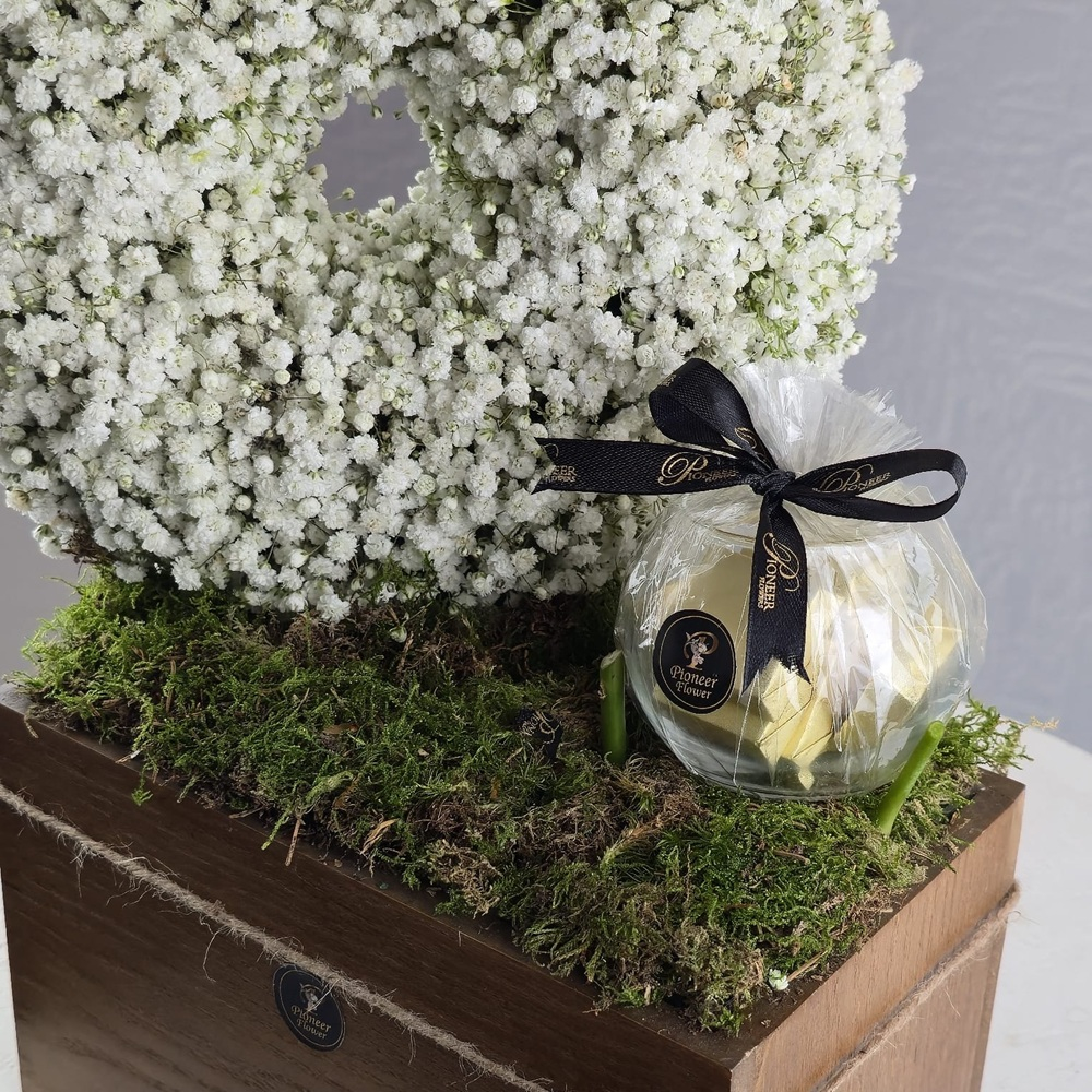 تحتوي الباقة على زهور البيبي جوري والجبسوفيلا، مرتبة على شكل خاتم ومرتبة في صندوق خشبي. تأتي مع الشوكولاتة البلجيكية.