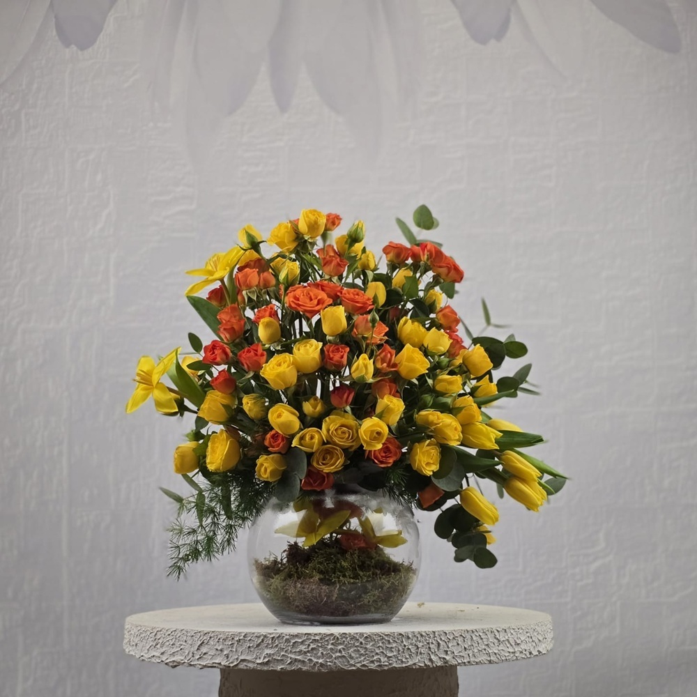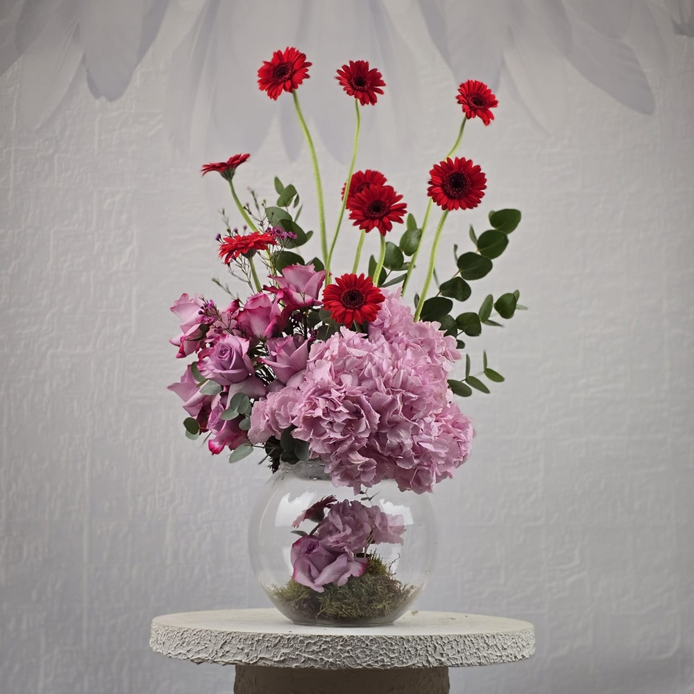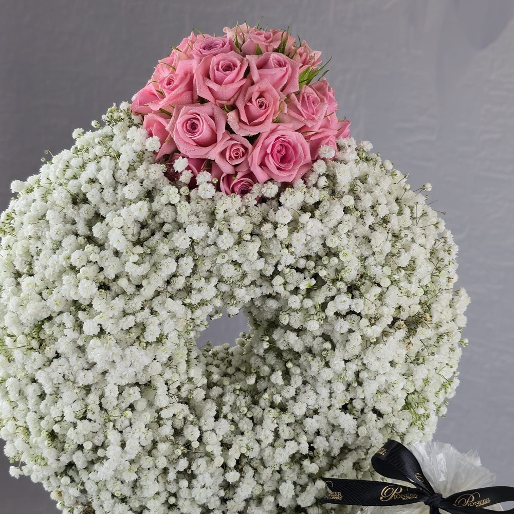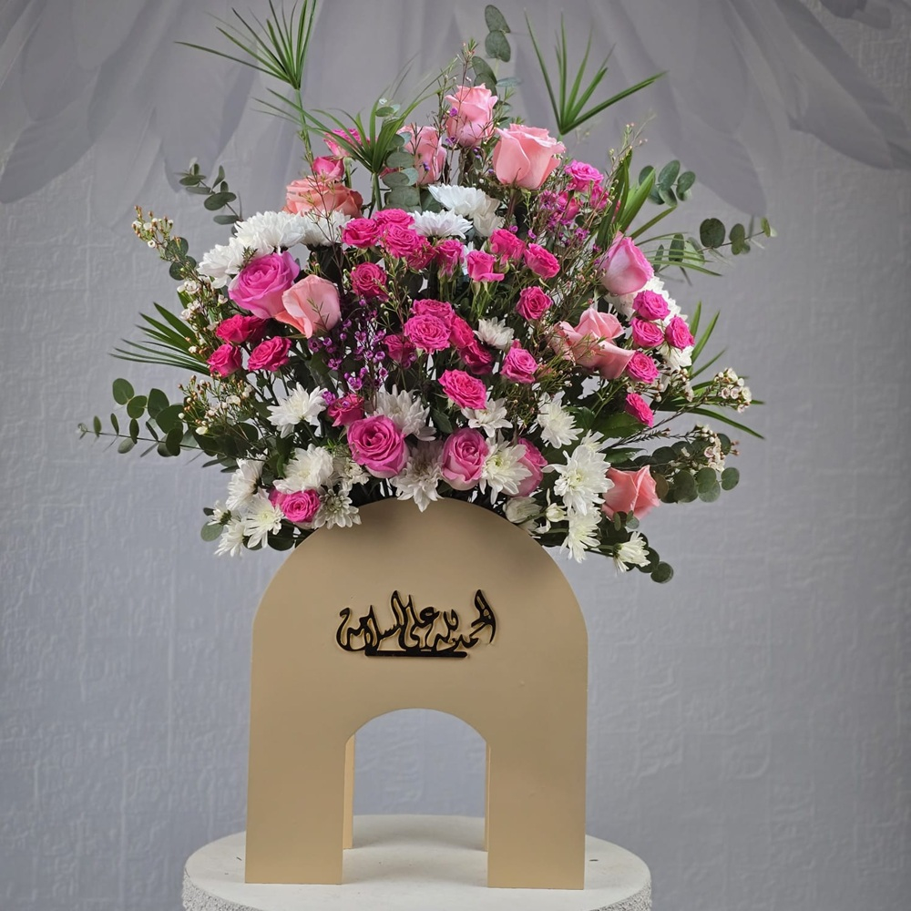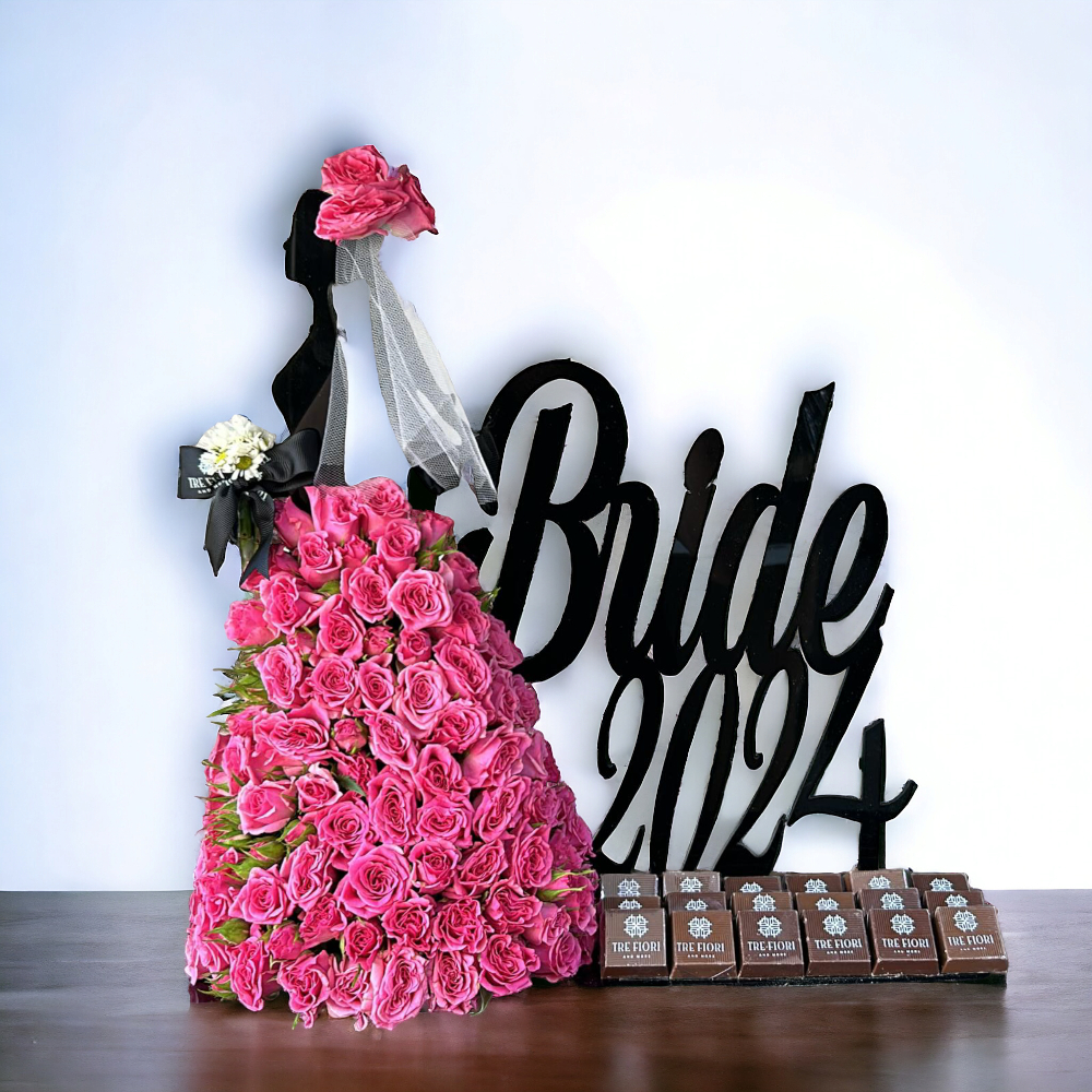 تحتوي الباقة على زهور البيبي جوري والجبسوفيلا، مرتبة على شكل خاتم ومرتبة في صندوق خشبي. تأتي مع الشوكولاتة البلجيكية.