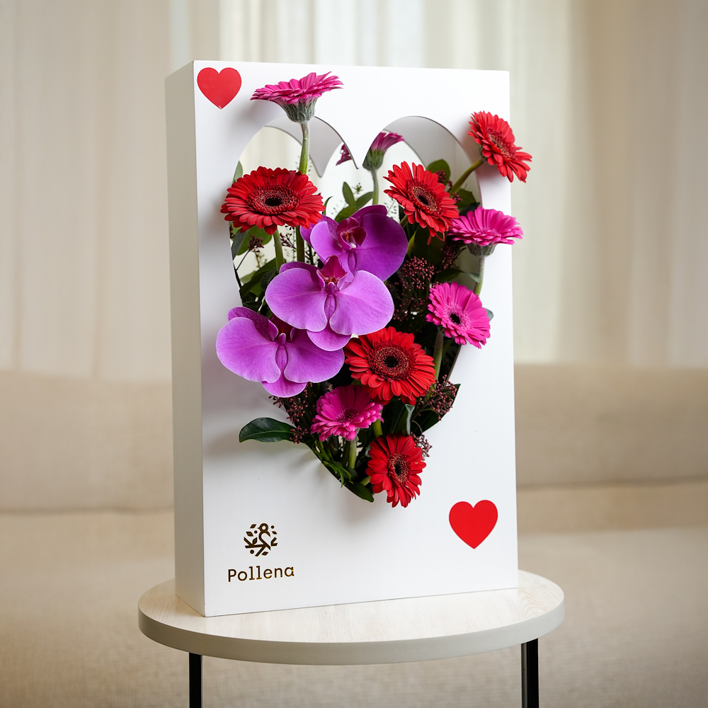 أكريليك تراي مع توبر "Happy Birthday" المضيء بإضاءة نيون بيضاء تحتوي على زهور الجوري ومزيج من الزهور بالوان زاهيه.