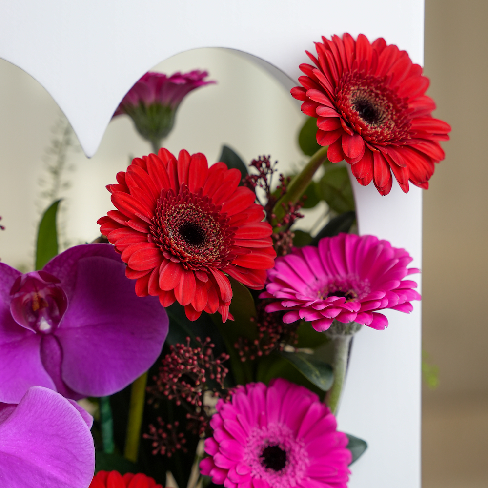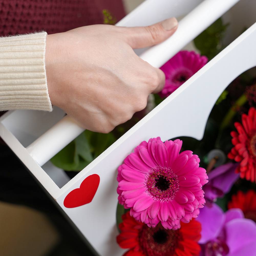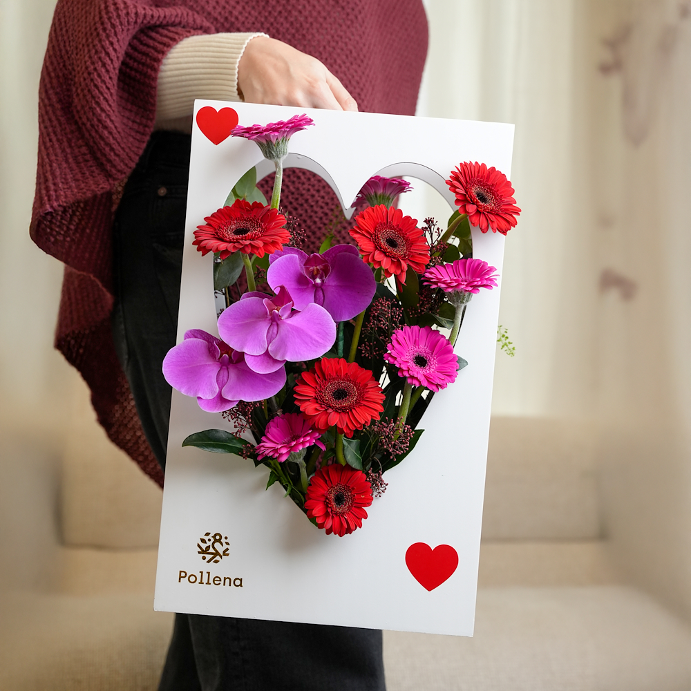 علبة على شكل قلب مرتبة بزهور الجيربيرا والأوركيد الزاهية. تنسيق مرح وأنيق، مثالي لإضفاء البهجة على يوم من تحب.