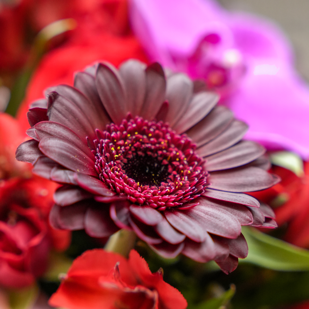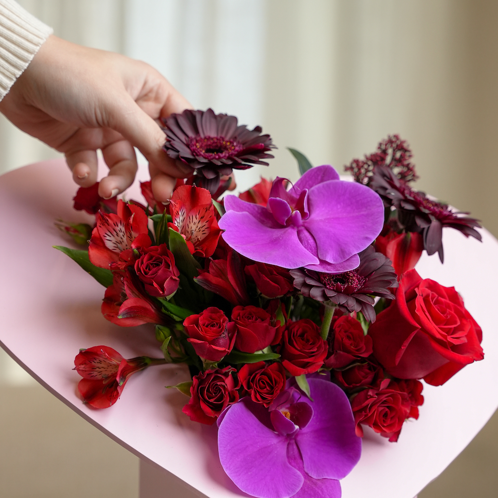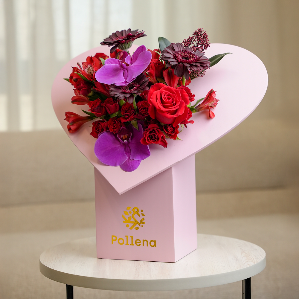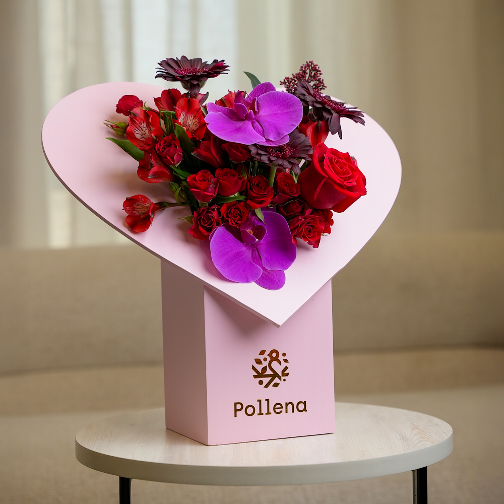 علبة على شكل قلب مرتبة بزهور الجوري، الألستروميريا، الجيربيرا والأوركيد، منسقة بعناية لتعبر عن الحب والرومانسية، مما يجعلها هدية مثالية ليوم الحب.