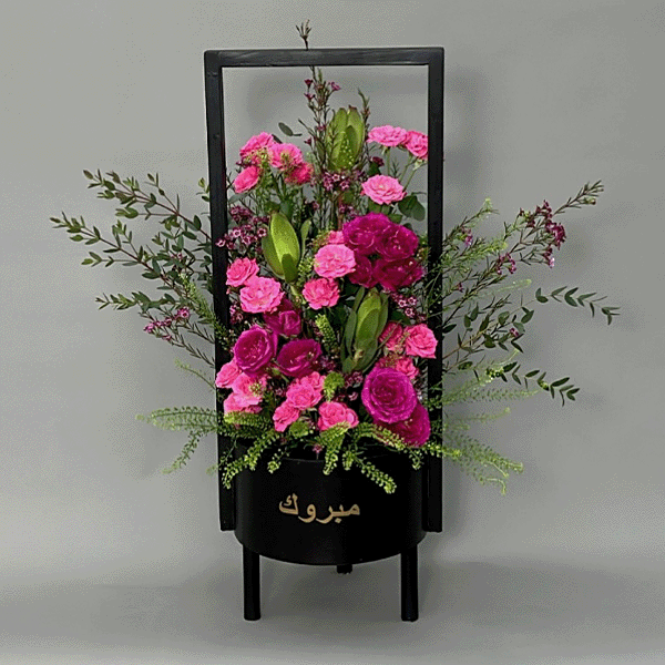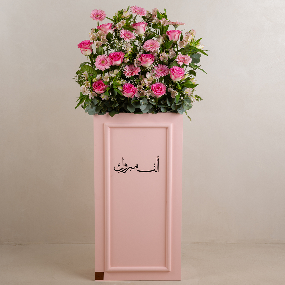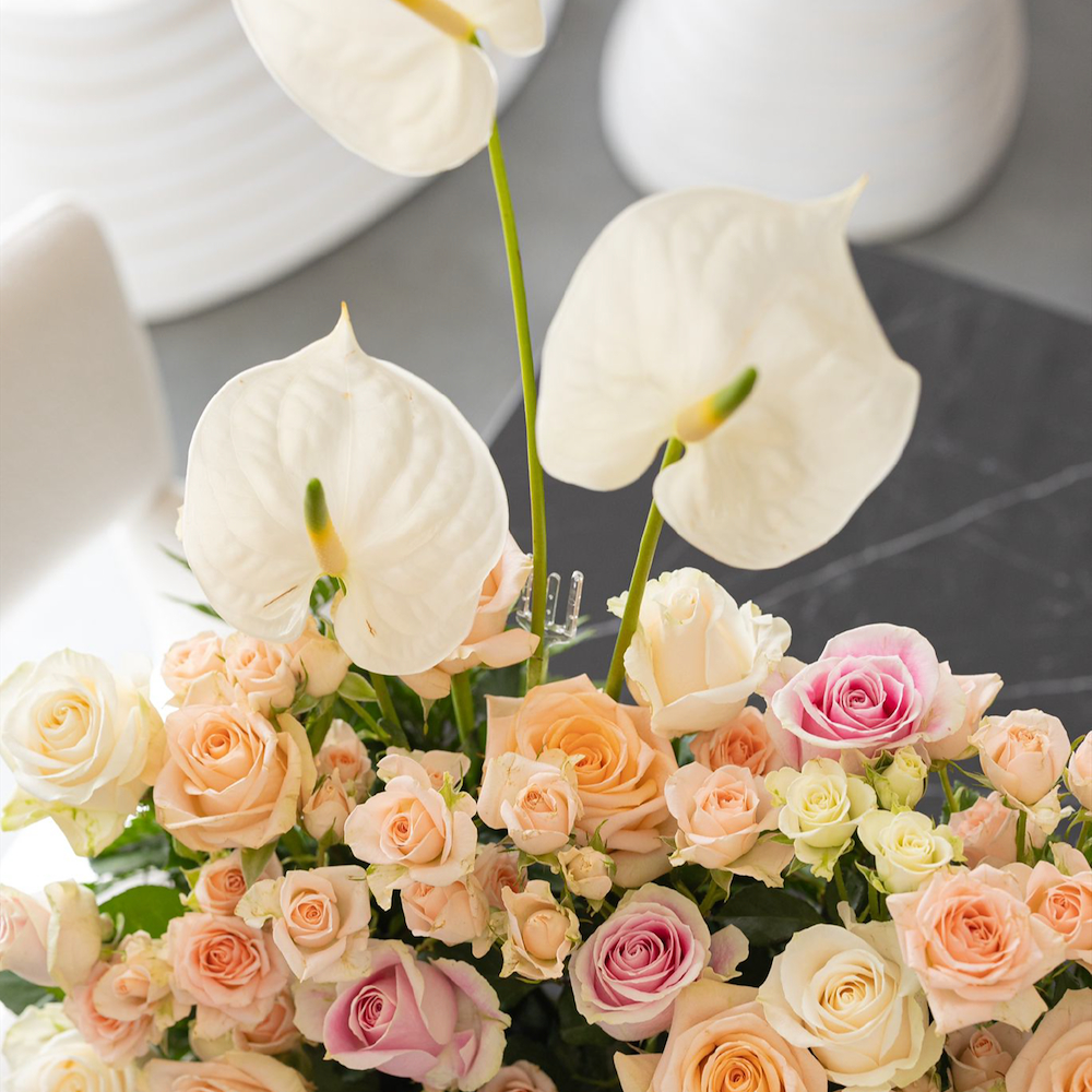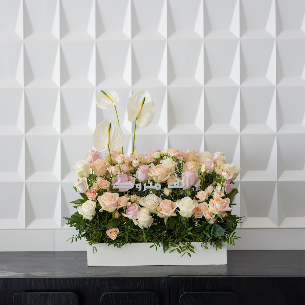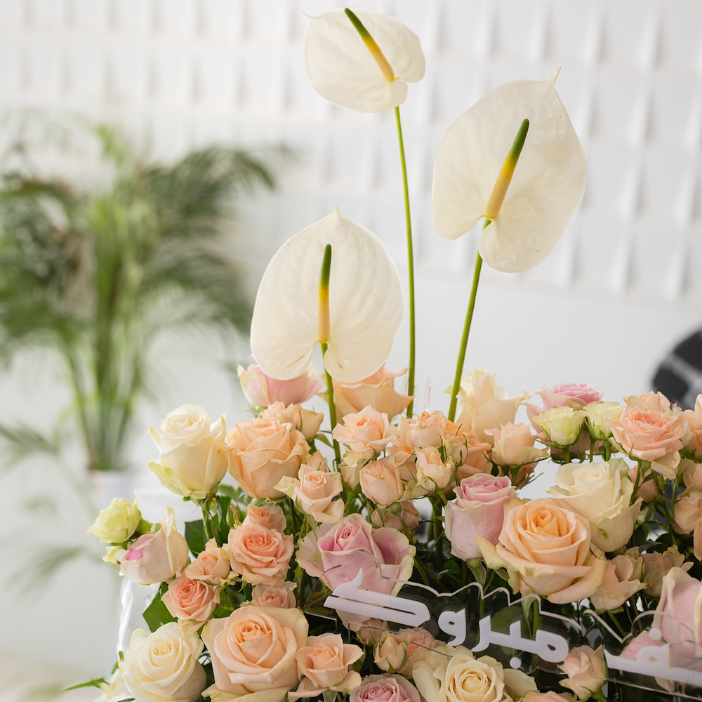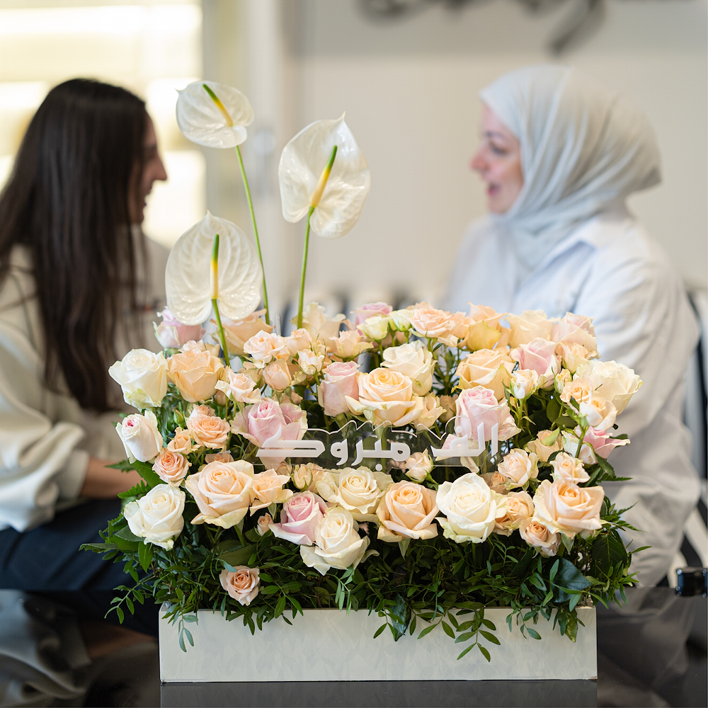 بوكس خشبي يحتوي على زهور الجوري والأنثوريوم.
