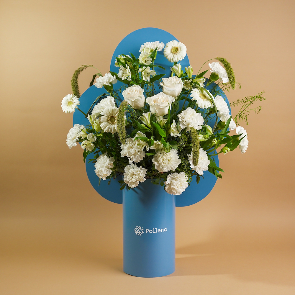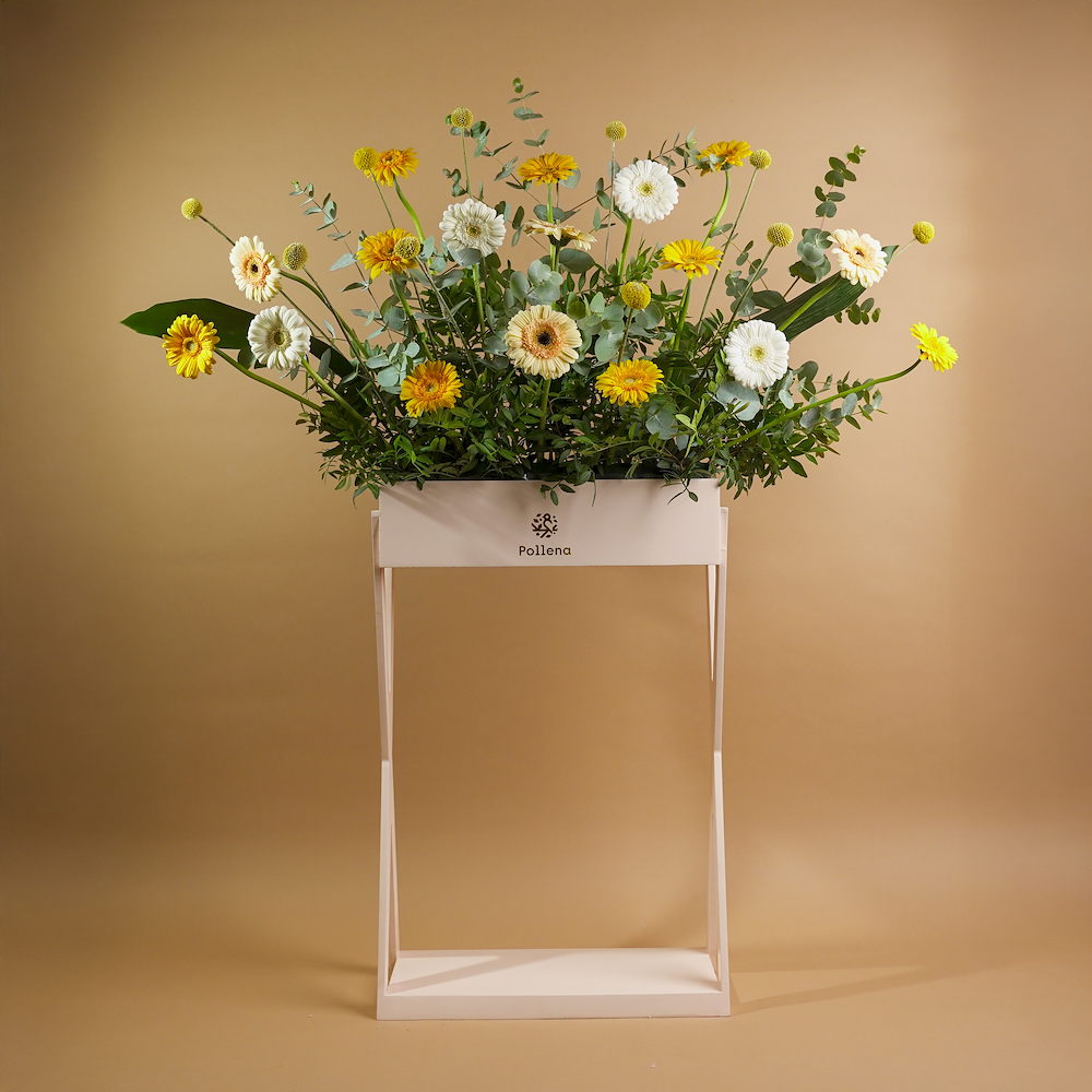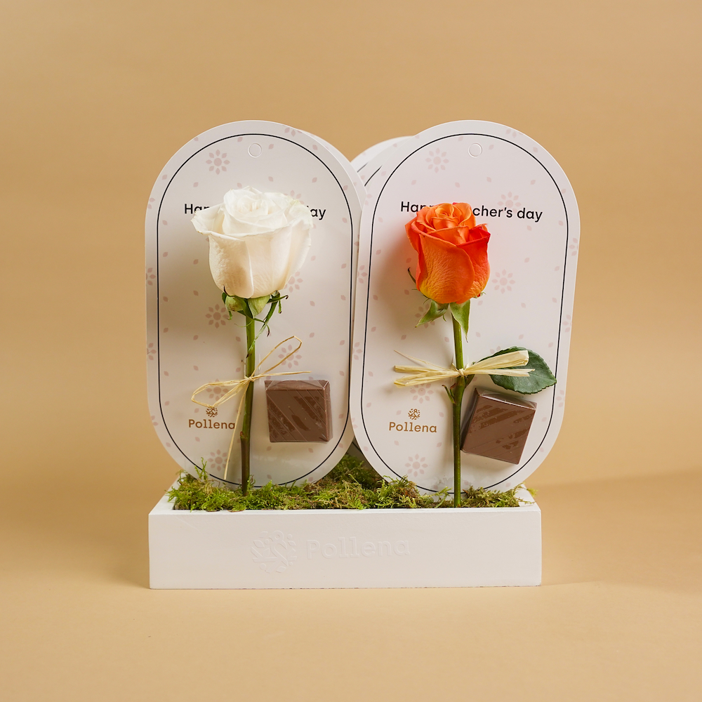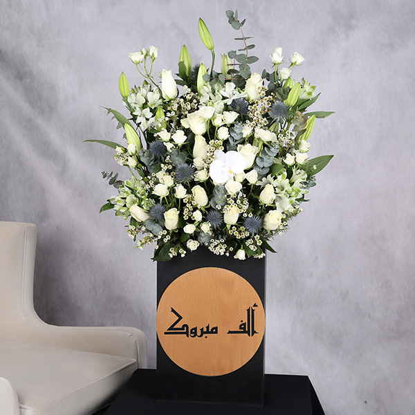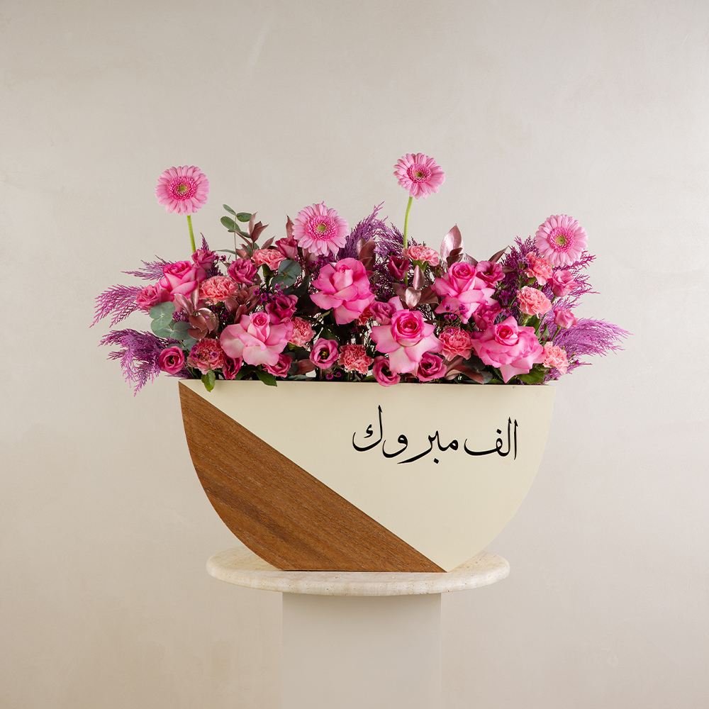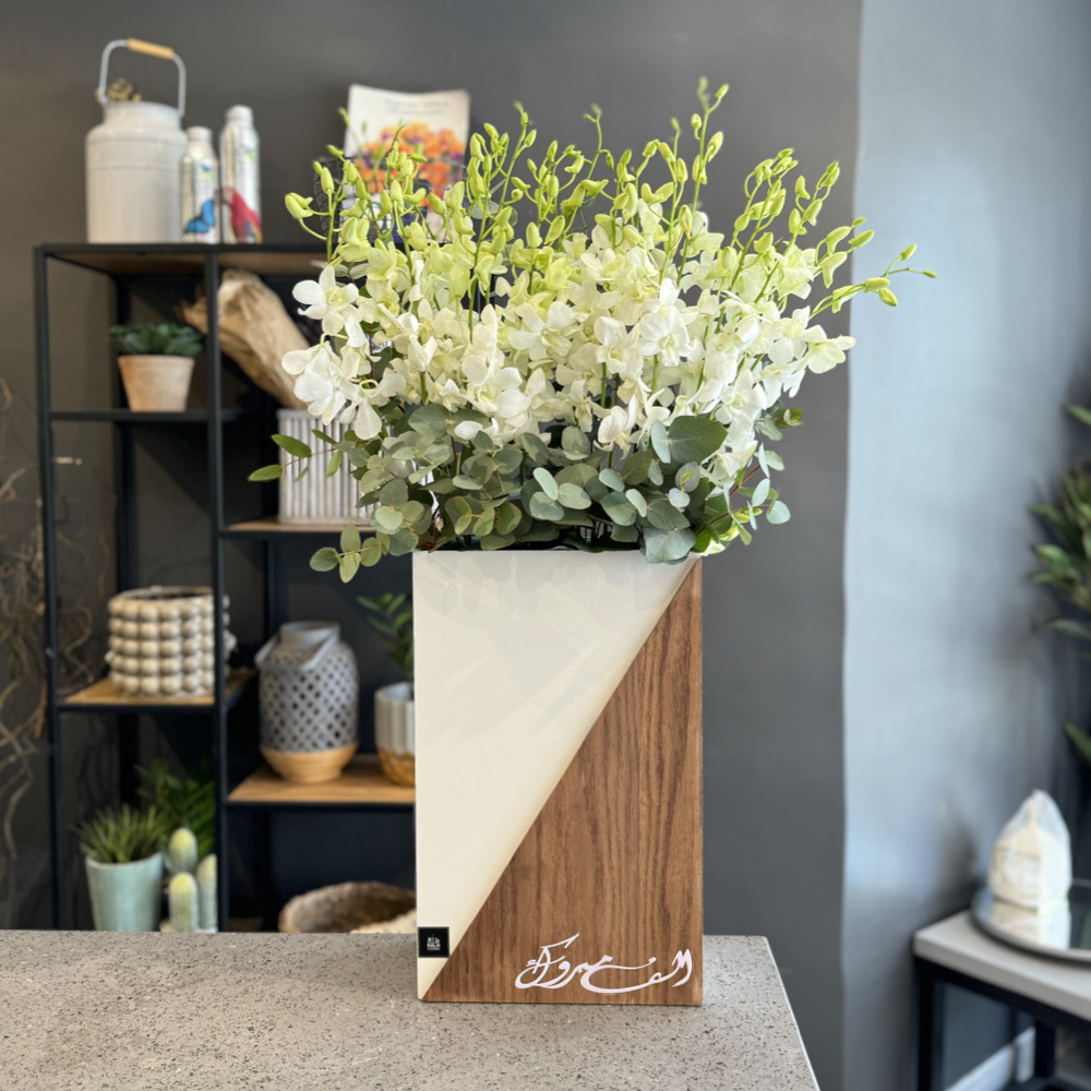 بوكس خشبي يحتوي على زهور الجوري والأنثوريوم.