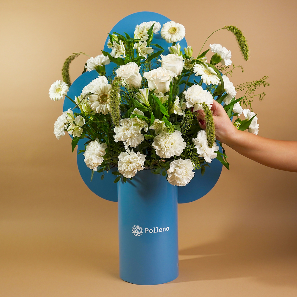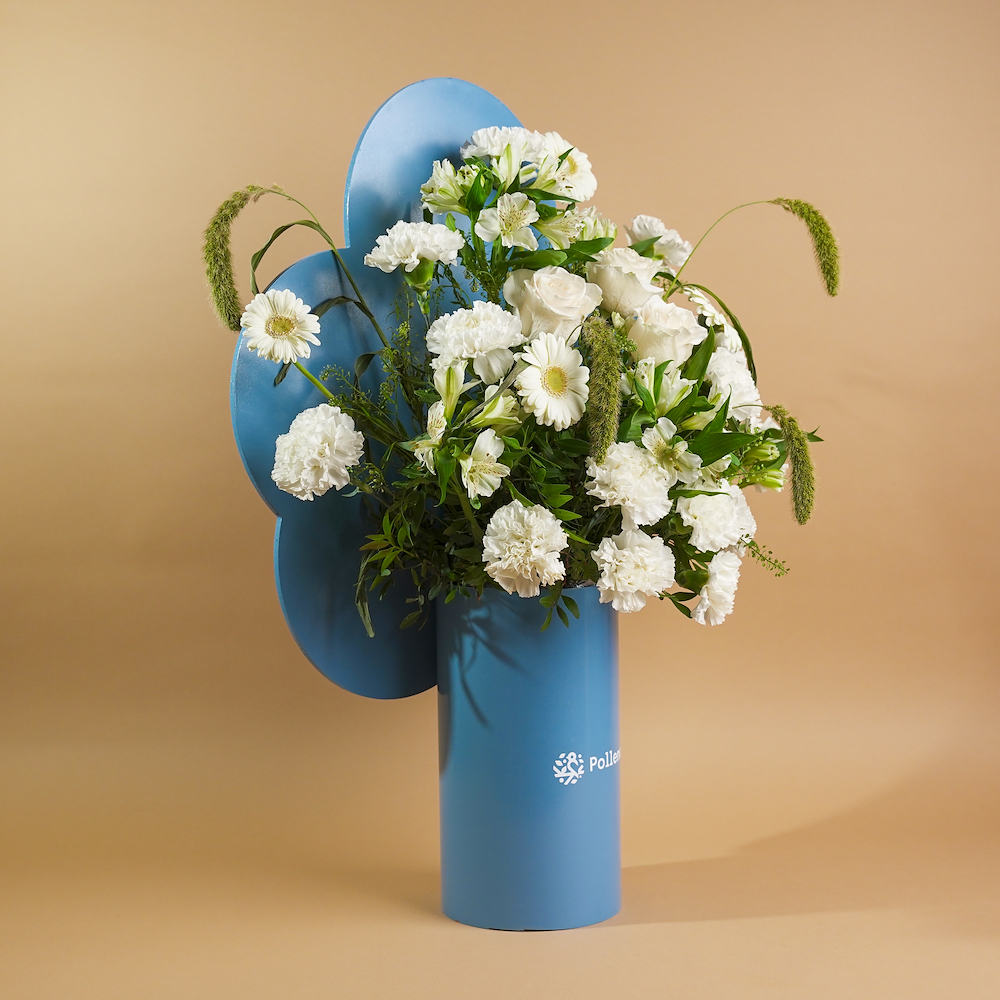 صندوق كبير يحتوي على مجموعة من الجربيرا والكرنيشن والجوري مع الخضار.