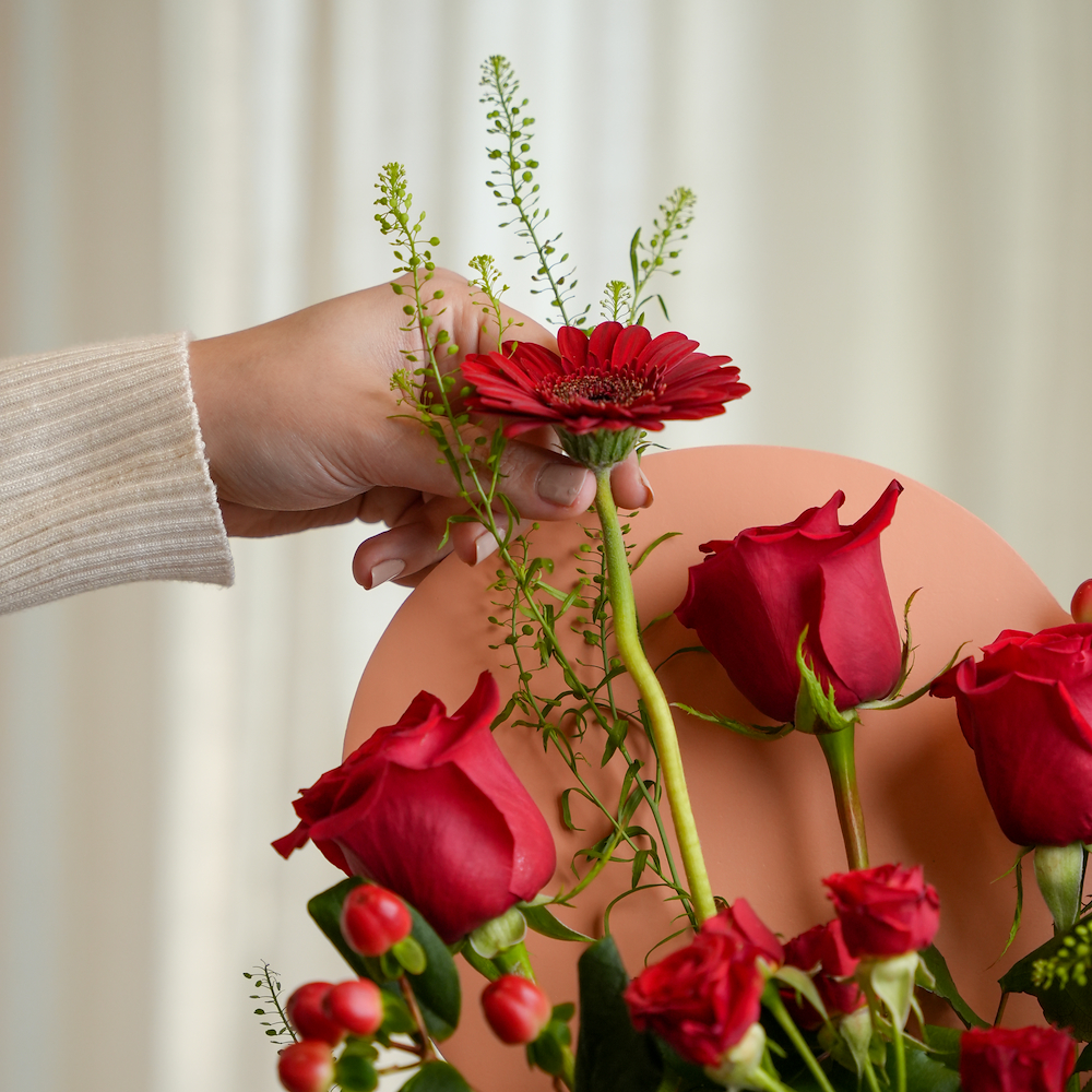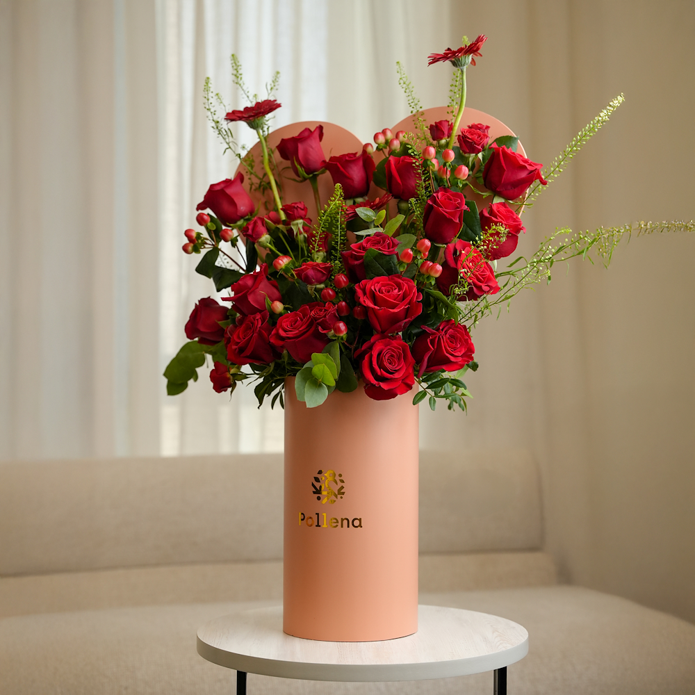 علبة على شكل قلب مرتبة بزهور الجوري، الجيربيرا والهايبريكم الحمراء. تنسيق رومانسي مصمم ليعبر عن الحب والمودة بشكل جميل.