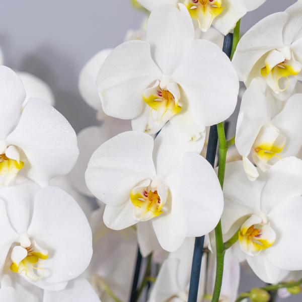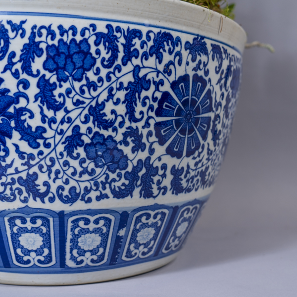 هذه الفازة بتصميم صيني كبيره مليئة بنباتات الأوركيد البيضاء.