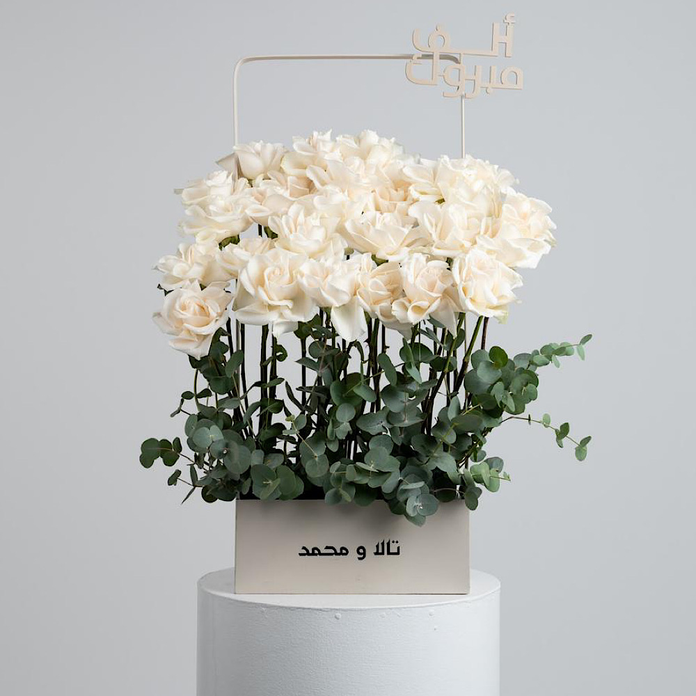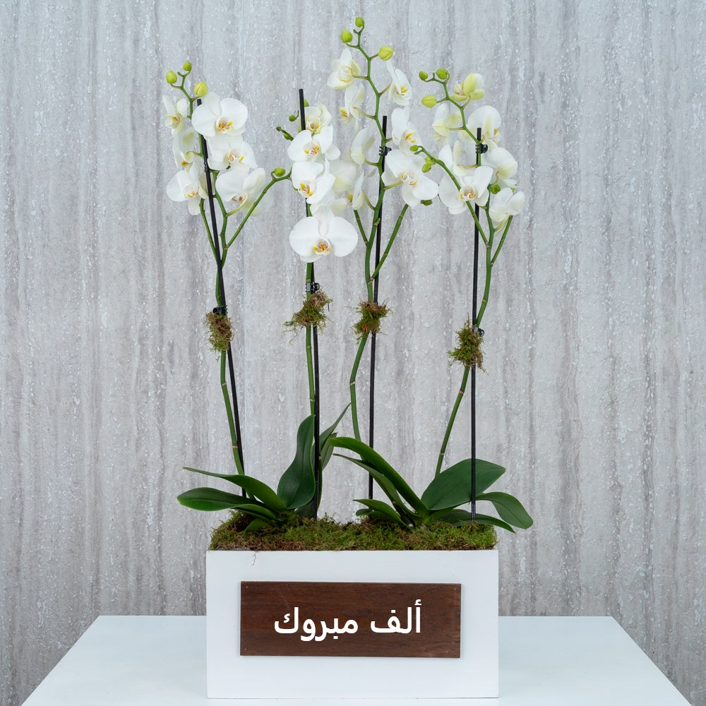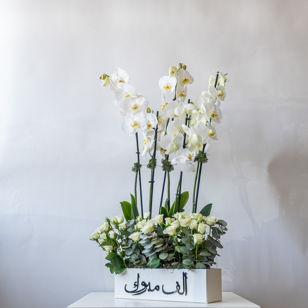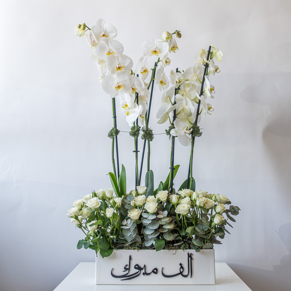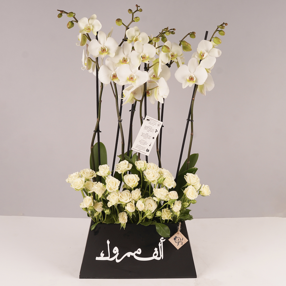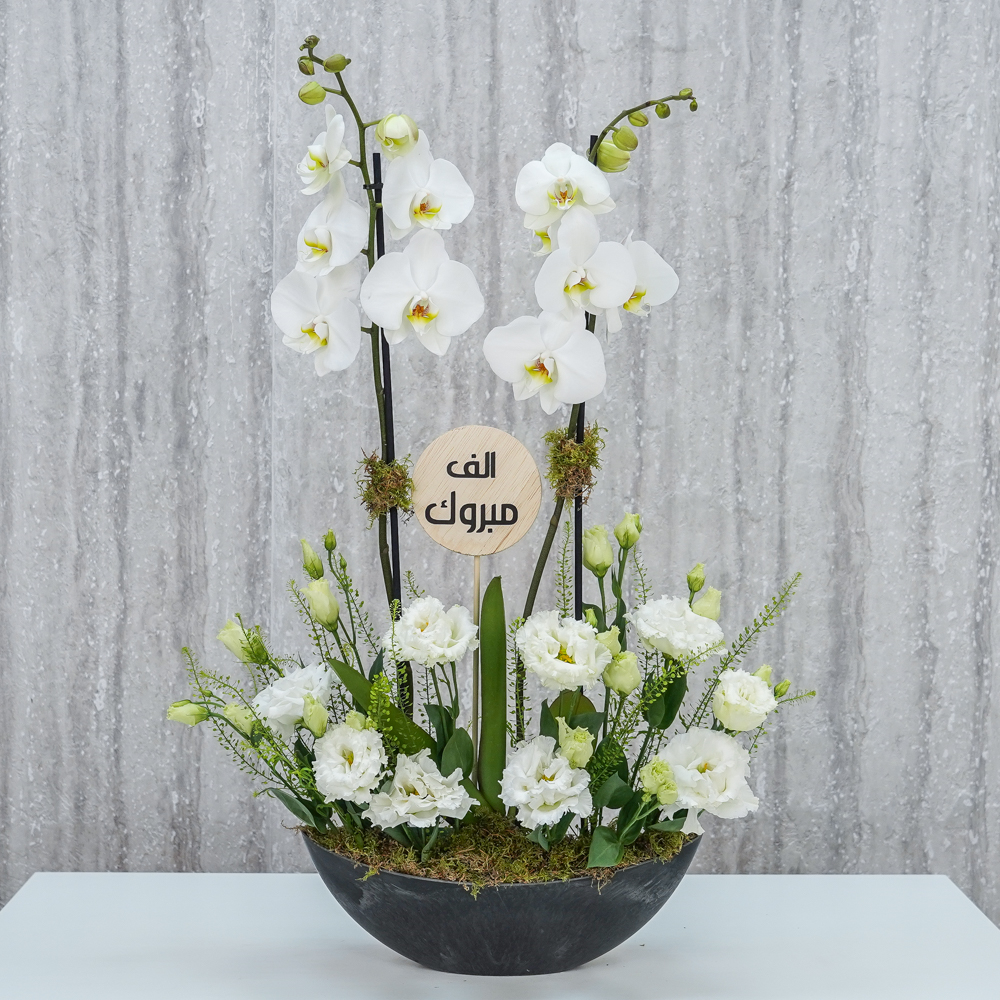هذا البوكيه يحتوي على الاوركيد وبيبي جوري.