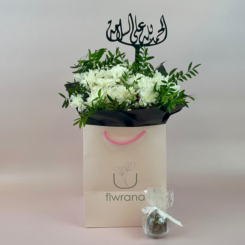 باقة يد مليئة بأزهار الكريز والأوراق الخضراء مع الشوكولاتة.