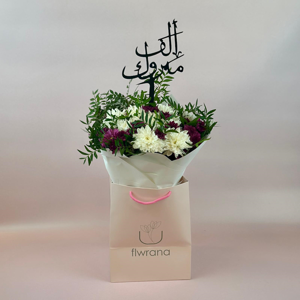 باقة يد مرتبة بزهور الكريز الأرجوانية والبيضاء والأوراق الخضراء.