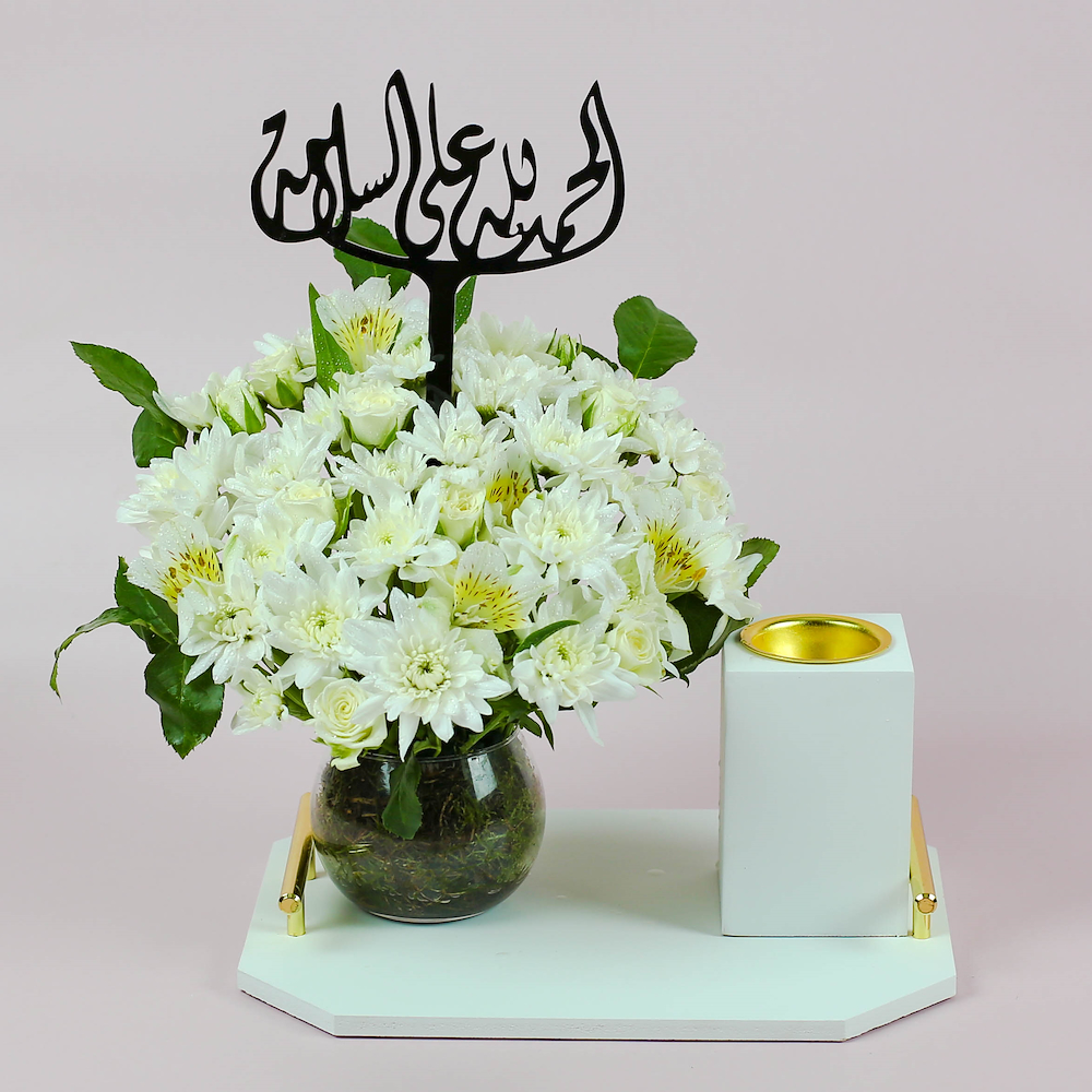 تحتوي هذه الباقة على أزهار الألستروميريا والكريزينتم مع مبخر.