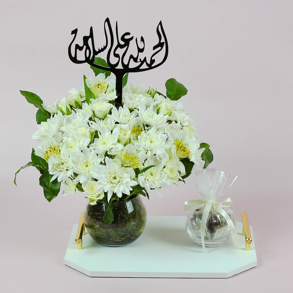 تحتوي هذه الباقة على أزهار الألستروميريا والكريزينتم مع الشوكولاتة.