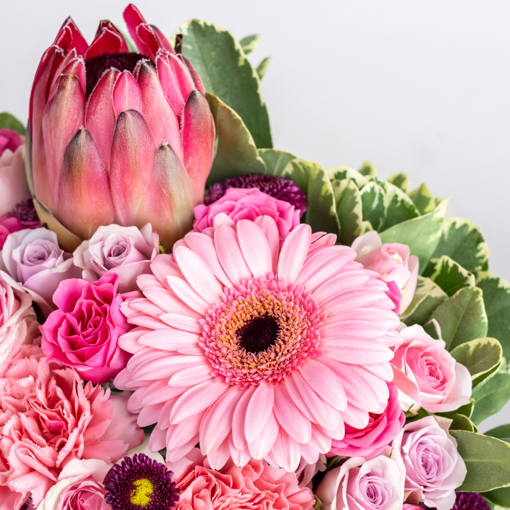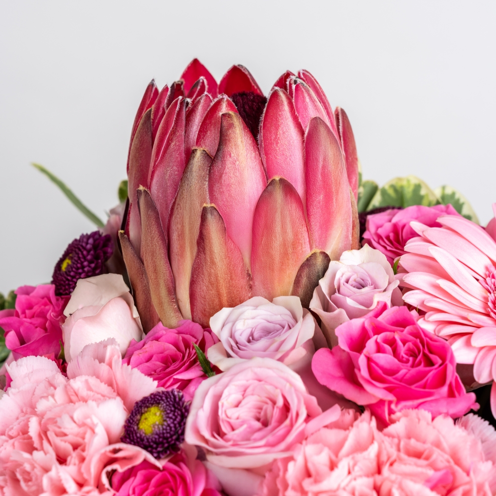 صندوق يحتوي على أزهار البروتيا البيبي روز، الكارنيشن والجربيرا، بتنسيق أنيق وجميل. هدية مثالية لإسعاد أي شخص بجمالها الطبيعي.
