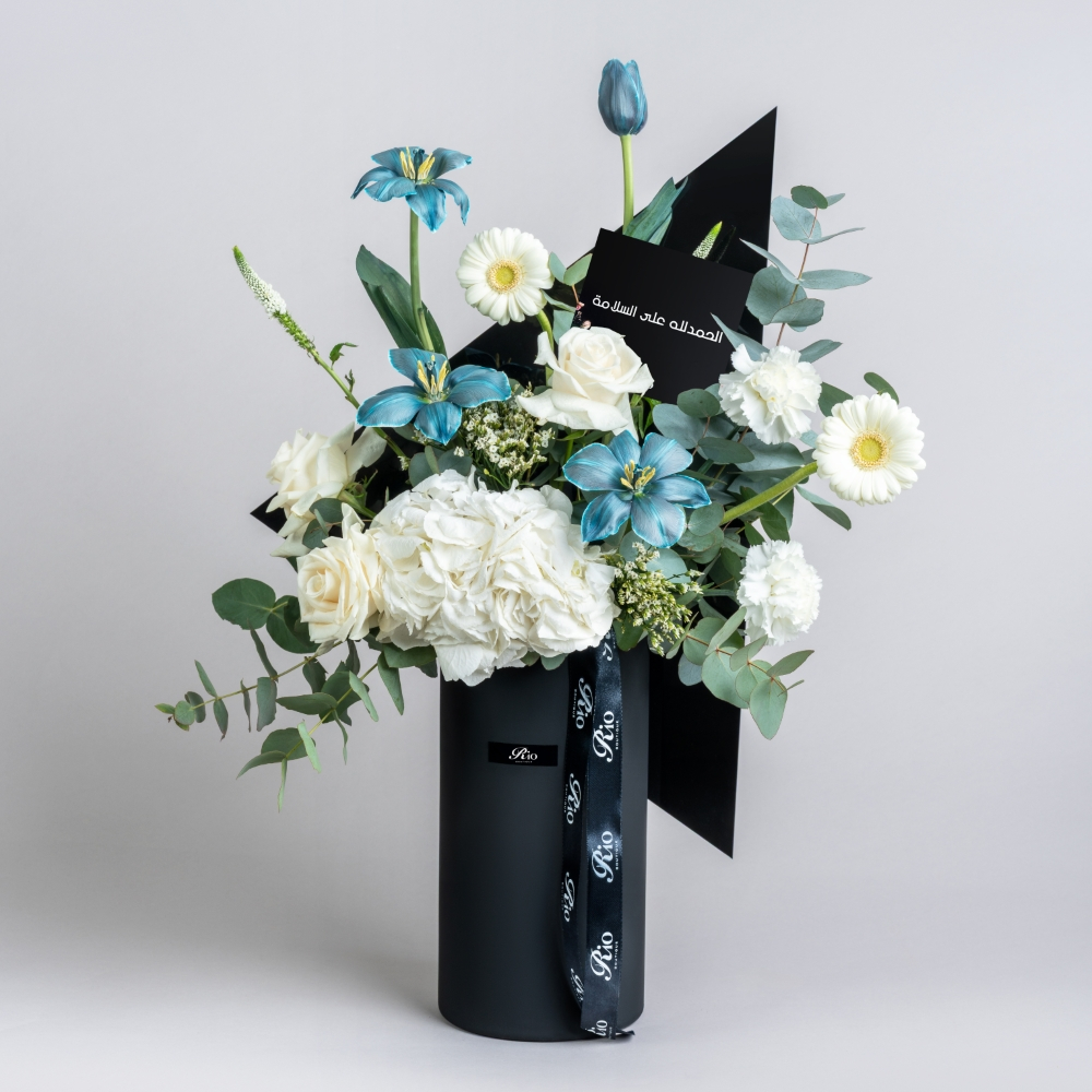 فازة تضم زهور التوليب، الجيربيرا، الجوري والهليدرينجا. تنسيق راقي يلائم أي مناسبة أنيقة.