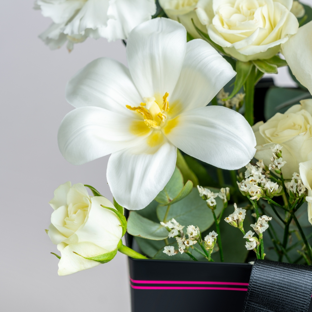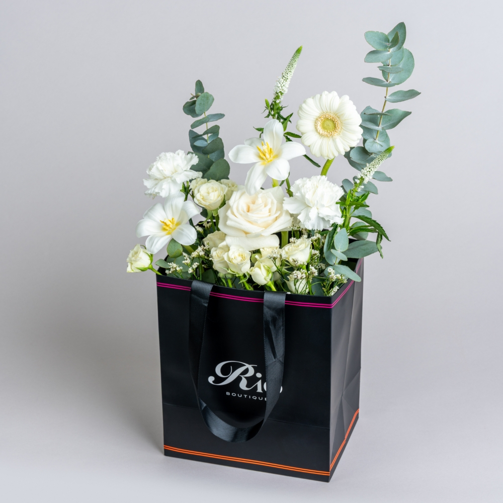 حقيبة أنيقة تضم التوليب، الجربيرا، الجوري والفِيرونيكا. مزيج حيوي مصمم لأي مناسبة.