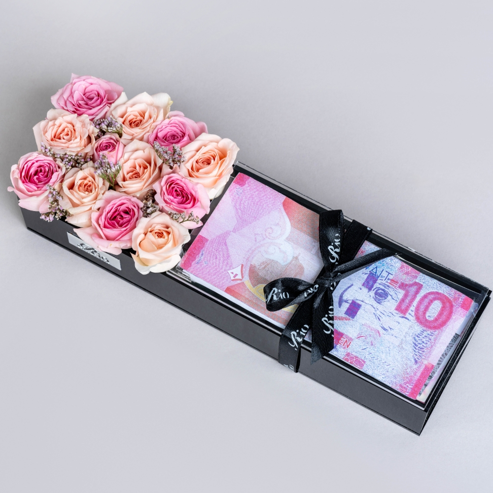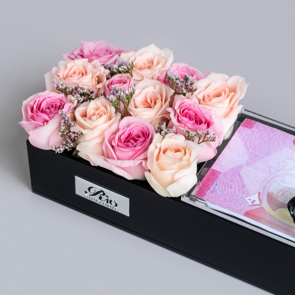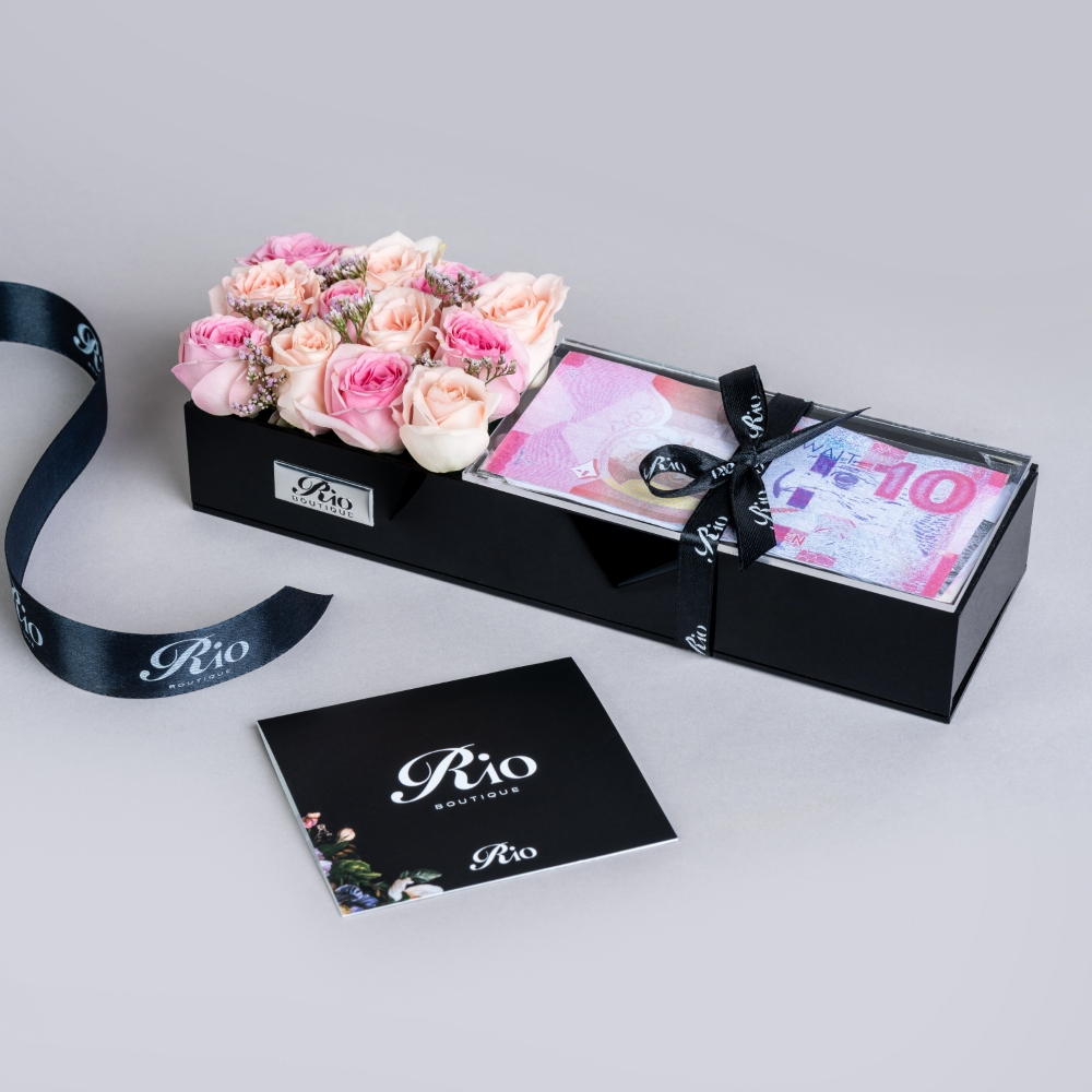 صينية صغيرة تحتوي على 4 من البيبي جوري مع صندوق أكريليك مخصص للهدايا النقدية. لفتة أنيقة للتهنئة أو لأي مناسبة. ملاحظة: الصينية لا تشمل النقود.