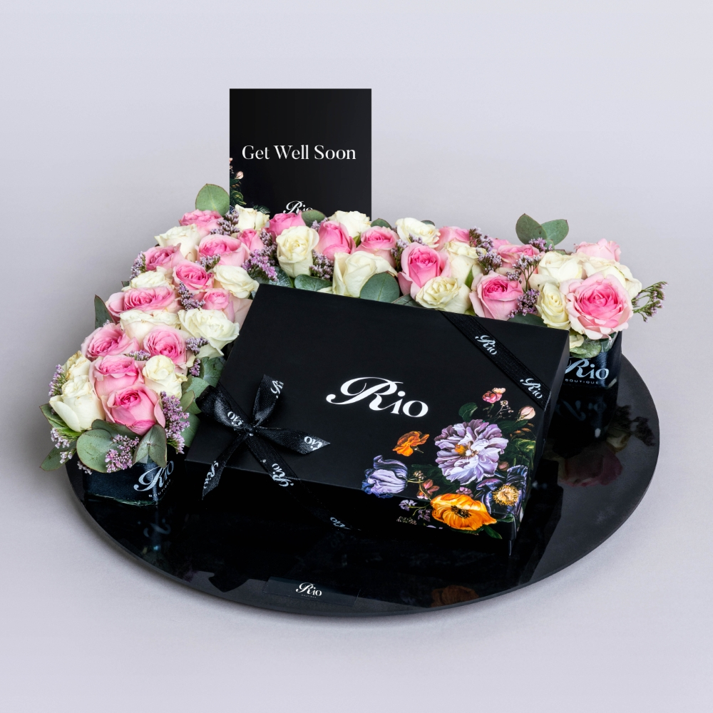 صينية تضم البيبي جوري مع علبة من الشوكولاتة الفرنسية الفاخرة. لمسة راقية تجمع بين الجمال والحلاوة لكل مناسبة مميزة.