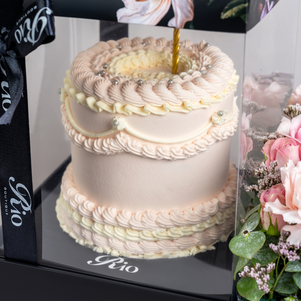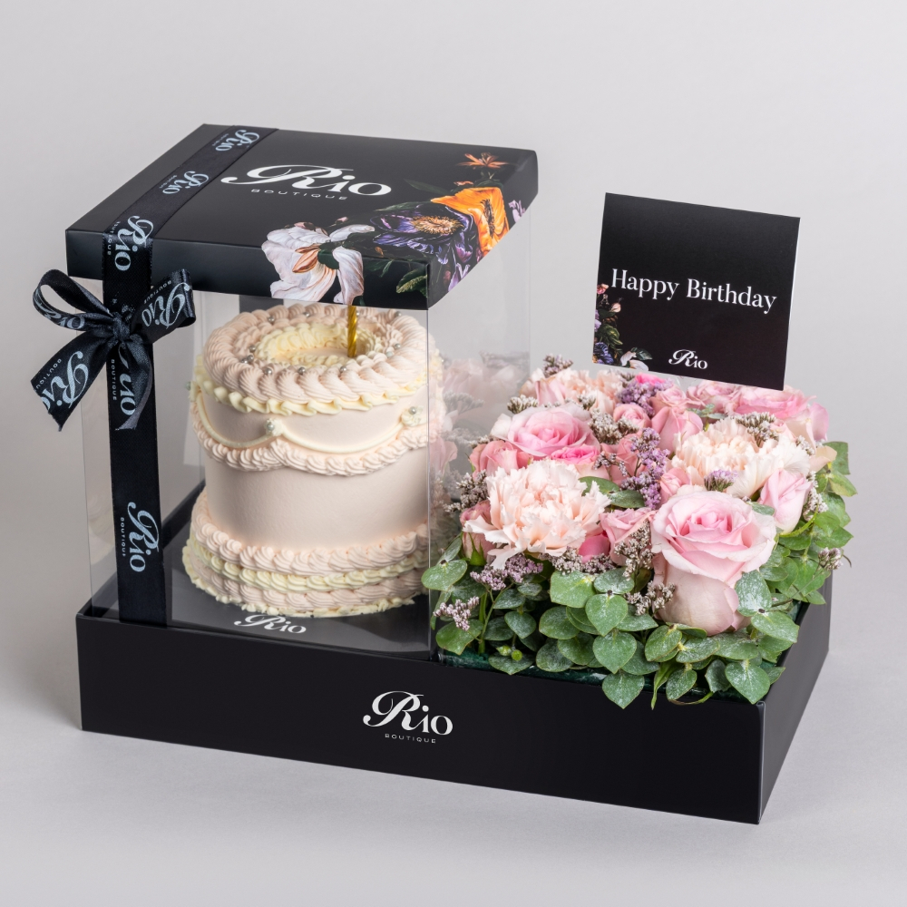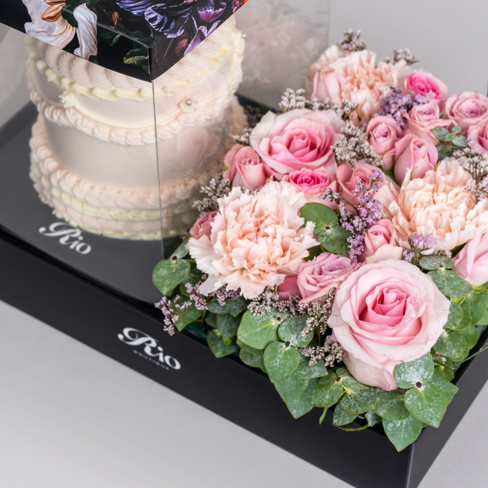 صينية أنيقة تضم زهور الجوري، البيبي جوري والكارنيشن مع كيكة شهية. هدية مفرحة للتهنئة أو لأي مناسبة مميزة.