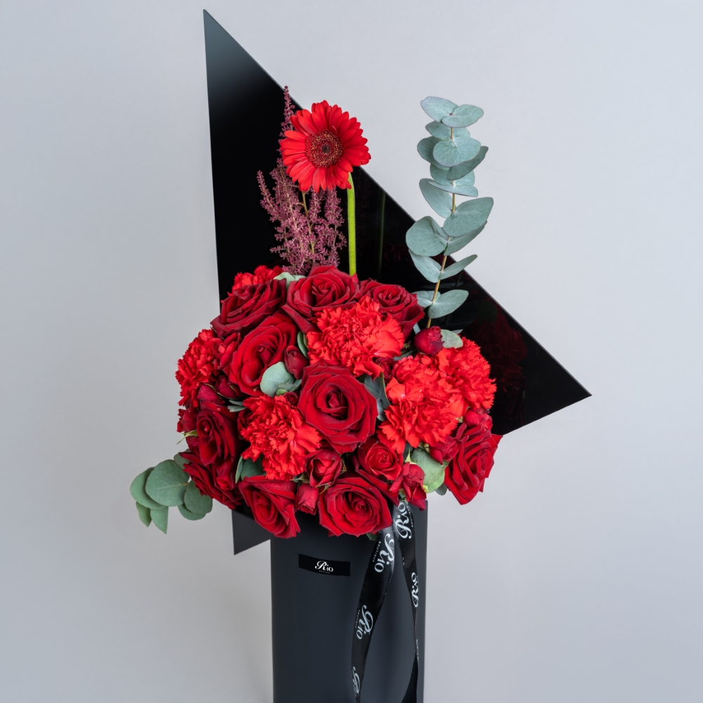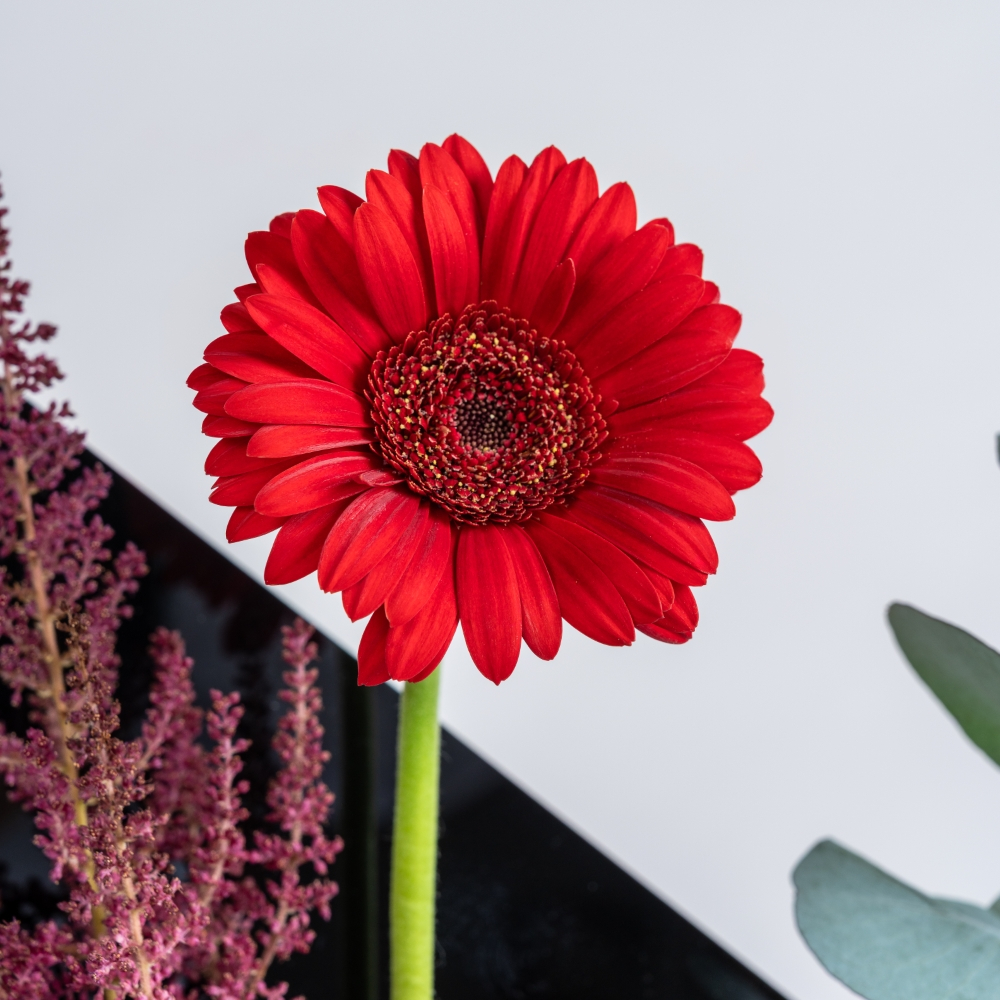 فازة طويلة منسقة بزهور الجريبيرا، الجوري، الكارنيشن والأستيلبي. تنسيق زهور جميل يناسب أي مناسبة.