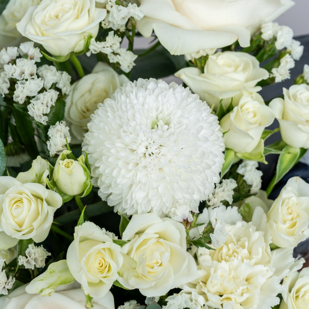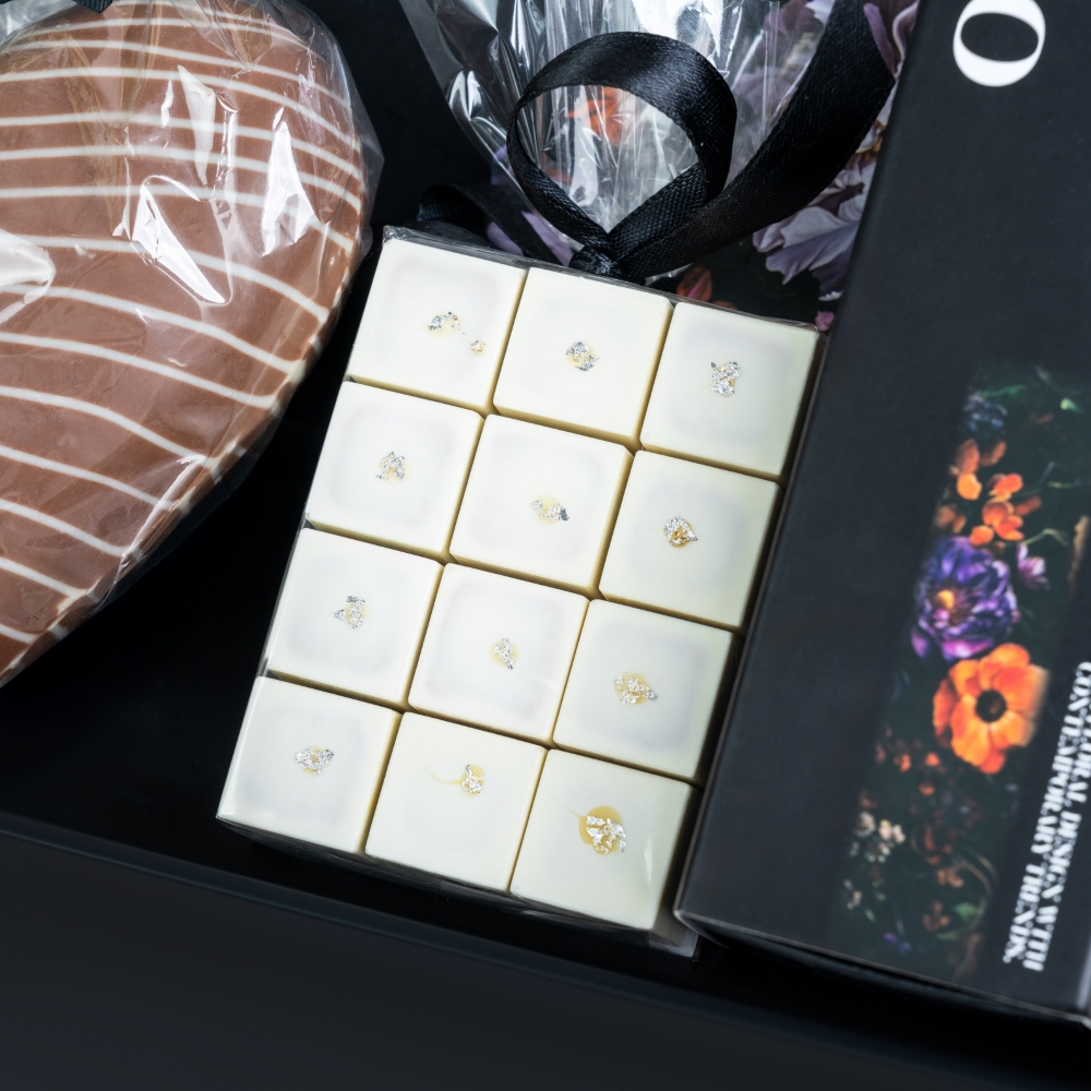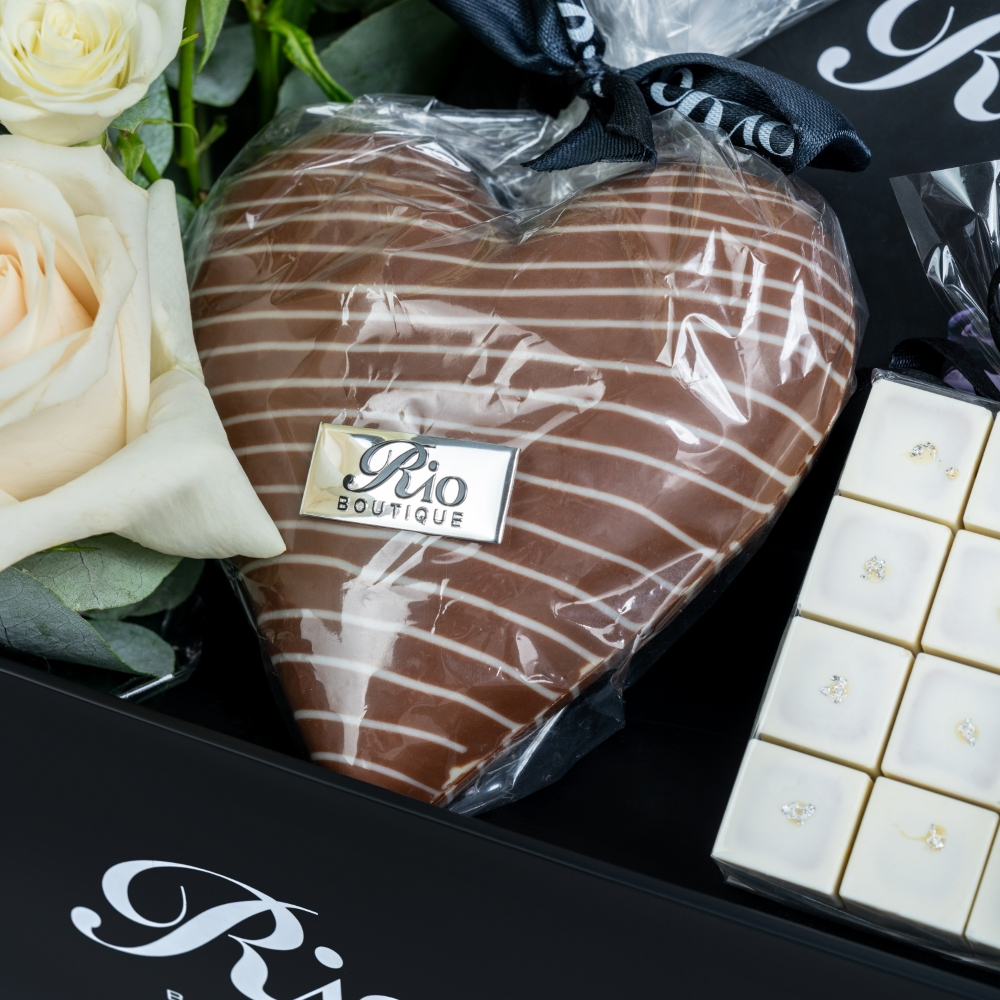 صندوق يحتوي على الجوري، البيبي جوري، والكارنيشن، مع مجموعة فاخرة من الشوكولاتة تشمل علبة، وعبوة صغيره، وقطعة بتصميم القلب، وعلبة من الماكرون. هدية راقية تجمع بين الزهور والحلويات بأناقة لأي مناسبة.