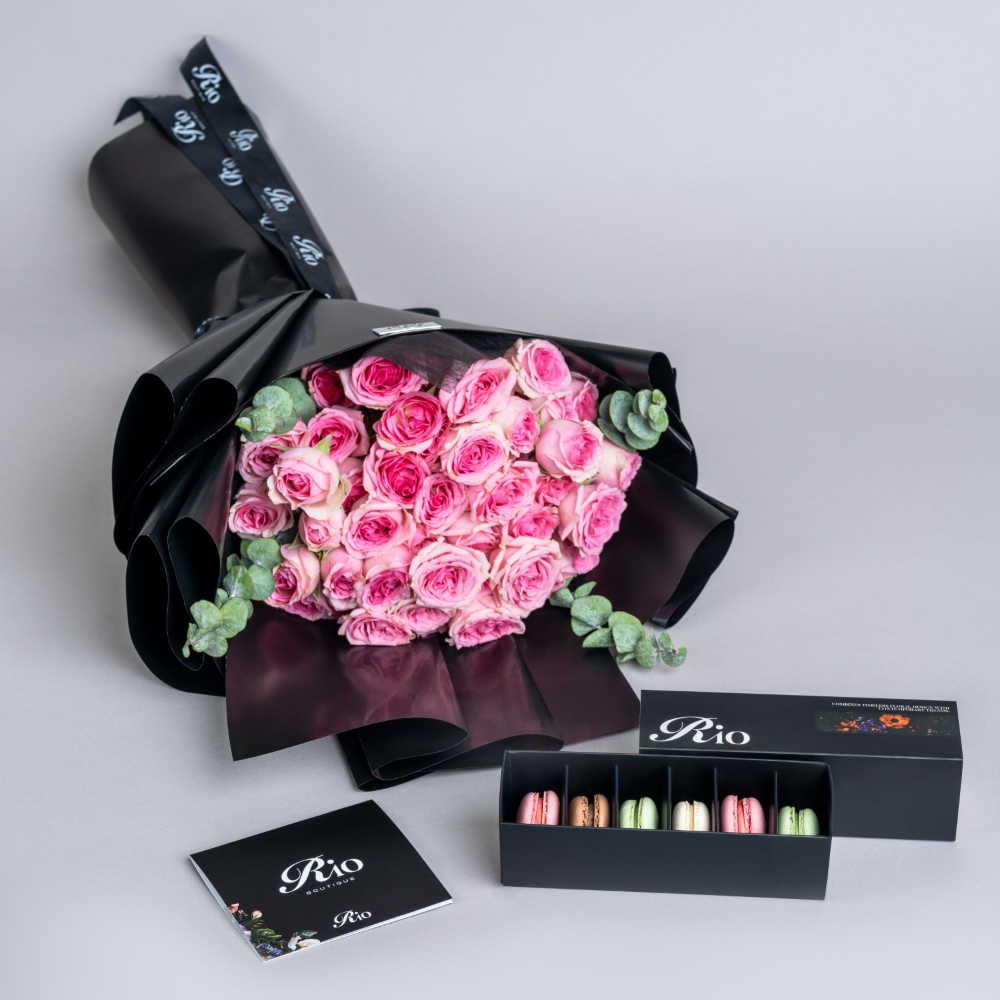 باقة يد تضم 10 من البيبي جوري باللون الوردي مع صندوق ماكرون. هدية زهرية مبهجة وحلوة لأي مناسبة.