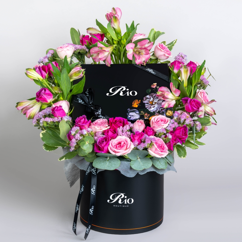 علبة أنيقة تضم زهور الألستروميريا والبيبي جوري مع علبة من الشوكولاتة الفرنسية الفاخرة. هدية راقية تعبّر عن الذوق الرفيع والمشاعر الدافئة.