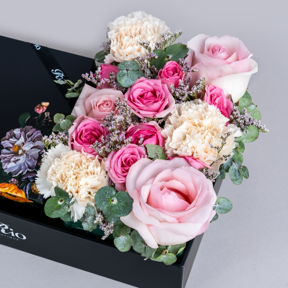 صينية رائعة تضم زهور الجوري، البيبي جوري والكارنيشن مع شوكولاتة فرنسية. مثالية للتهنئة أو للمناسبات الحلوة.