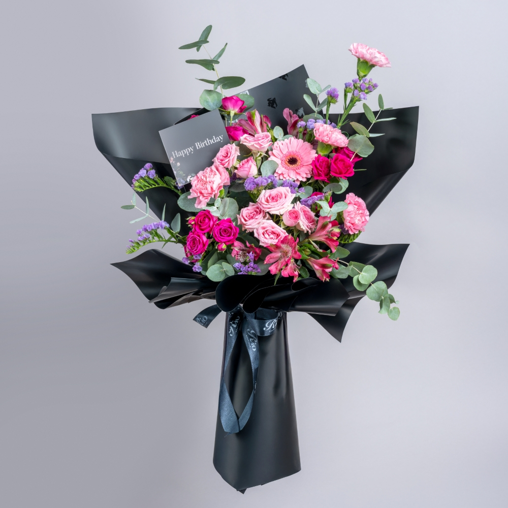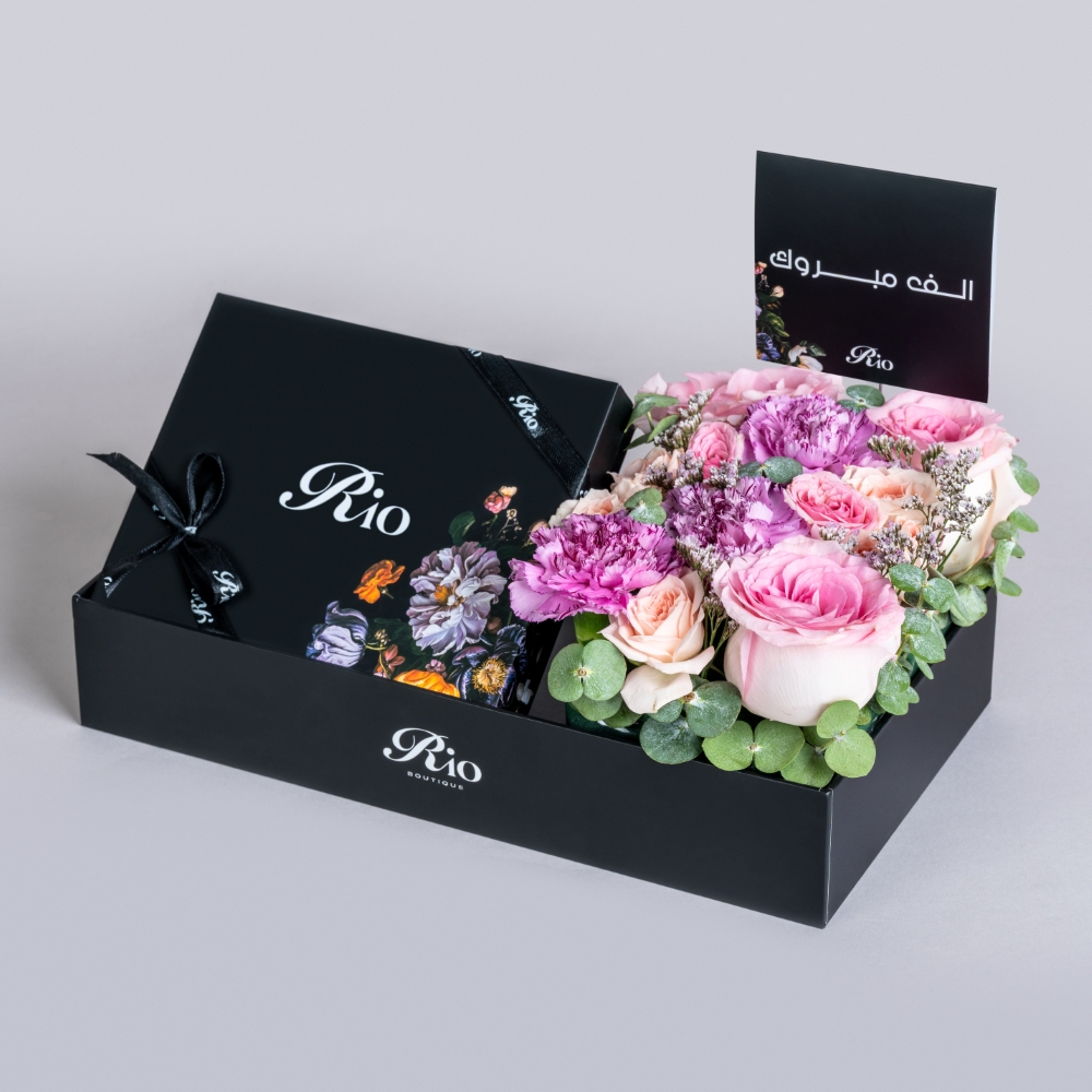 صينية تحتوي على الجوري، بيبي جوري، والكارنيشن مع علبة شوكولاتة فرنسية فاخرة. هدية راقية تجمع بين الأناقة والحلاوة لأي مناسبة مميزة.