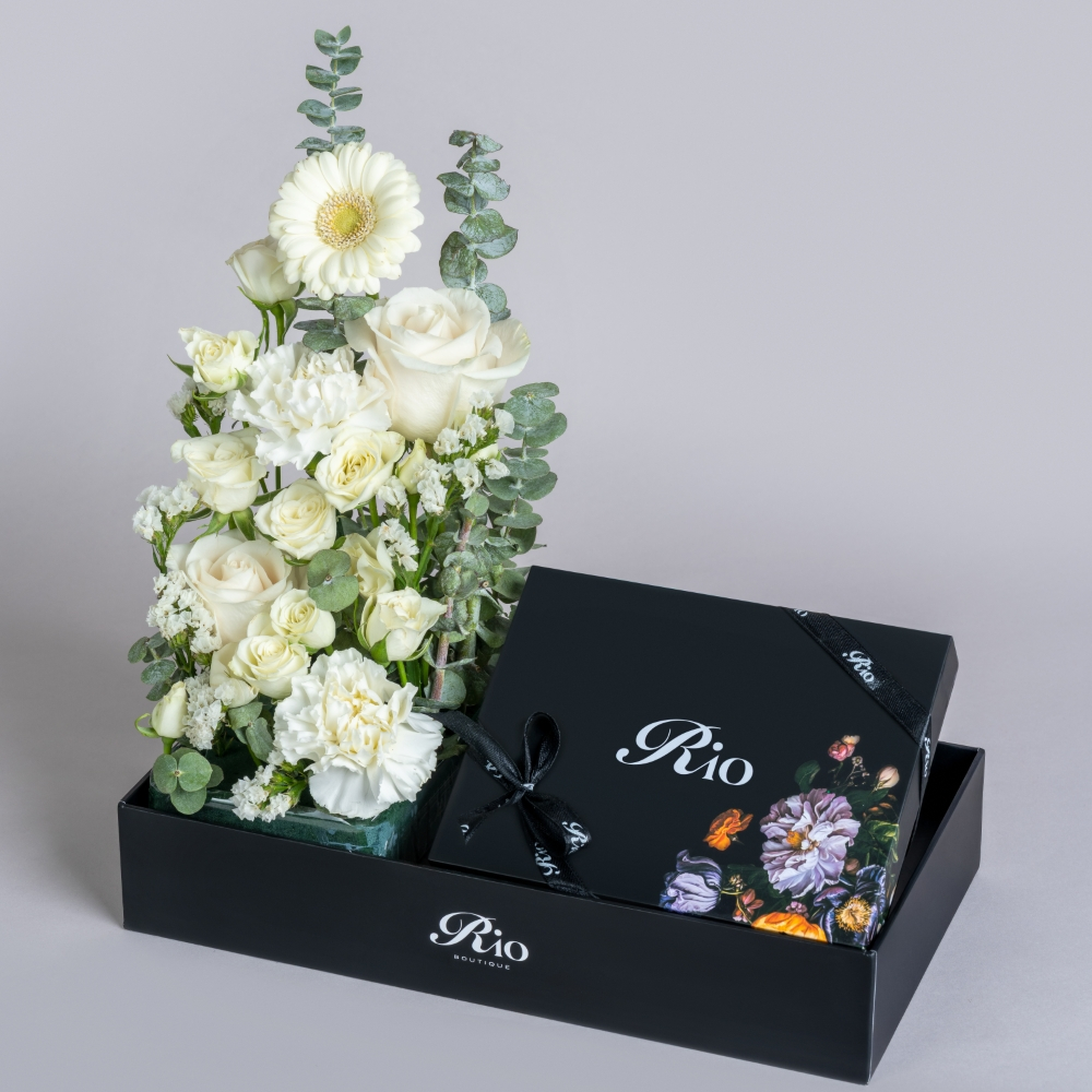صينية مليئة بالجوري، الجربيرا، والكارنيشن مع علبة شوكولاتة فرنسية فاخرة. هدية أنيقة ومبهجة تضيف لمسة من الجمال لكل مناسبة.