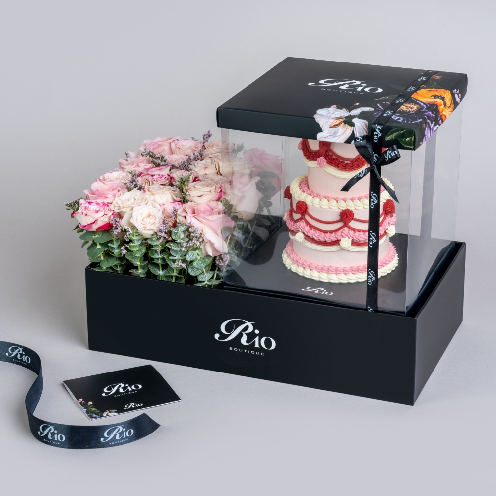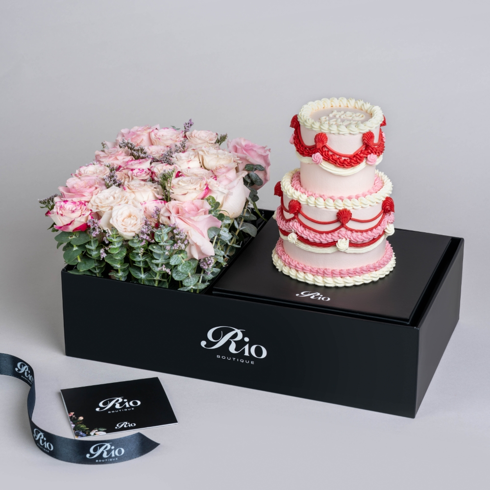 صندوق يضم 12 من الجوري والبيبي جوري مع كيكة. هدية أنيقة وحلوة لأعياد الميلاد أو لأي احتفال مبهج.